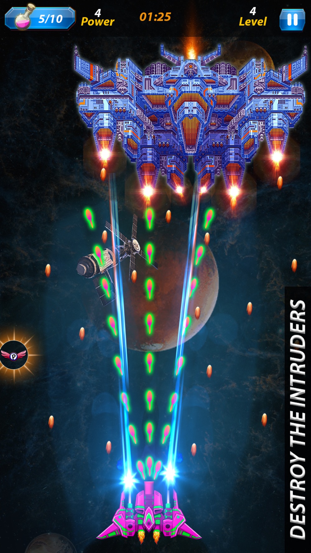 Earth’s very existence is threatened. Alien invaders from space have been sent to destroy our planet. You have been called up to repel their attack. You must plan your battle strategy well and upgrade your fighter ship to defeat the increasingly advanced aliens. To accomplish this task, you must have the courage and wisdom.