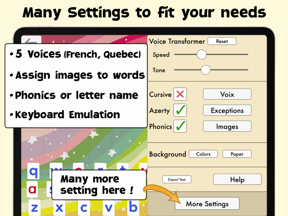 • Many, many settings to adapt the activities to the child’s needs (letter size, assign images to words, high contrast modes for kids with visual impairment,...)