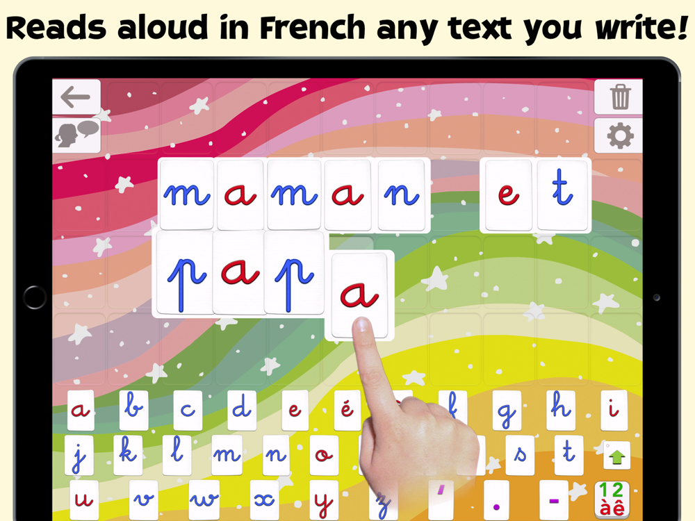 • 4 keyboards available: letters, numbers, consonant digraphs (like “ch”) and vowels digraphs (like “au”)