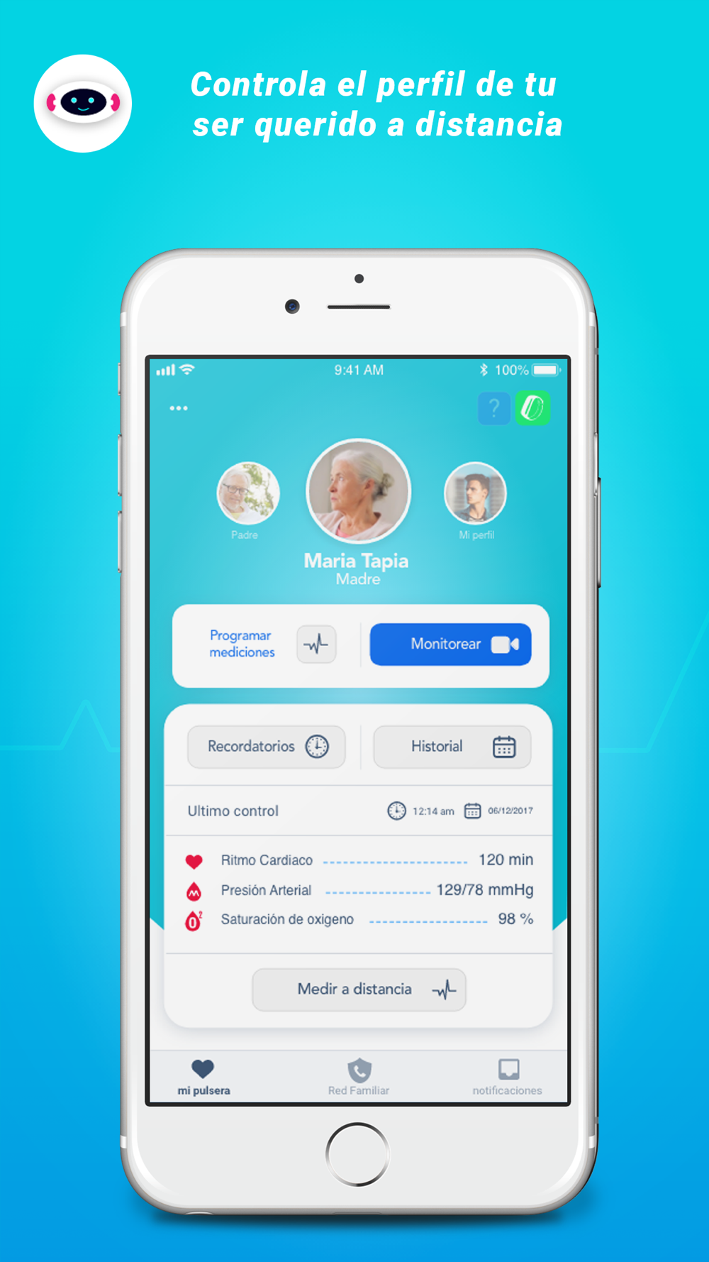 También cuenta con Control a Distancia Maneja el perfil de tu tata desde la aplicación móvil desde cualquier lugar que te encuentre puedes asignarles, mediciones, monitoreo y recordatorios. También se cuenta con una red de familiar de tú ser querido. Toda persona que conforme la red podrá, desde su trabajo o cualquier otro lugar, monitorear y medir el estado de salud del Tata.