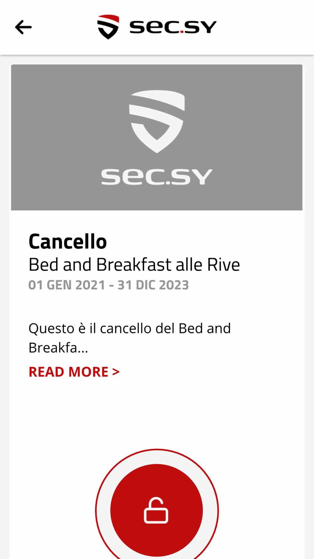 SEC.SY è un’applicazione per smartphone da usare al posto delle chiavi fisiche tradizionali per aprire varchi come porte e cancelli. È un portachiavi digitale che permette di comandare qualsiasi serratura elettrica. SEC.SY funziona grazie alla connessione con il dispositivo fisico S1, la centrale di controllo installata presso la struttura da richiedere al proprio installatore di fiducia o sul sito www.secsy.cloud. L'applicazione SEC.SY comunica con la centrale sia con connessione 3G/4G sia con Bluetooth.