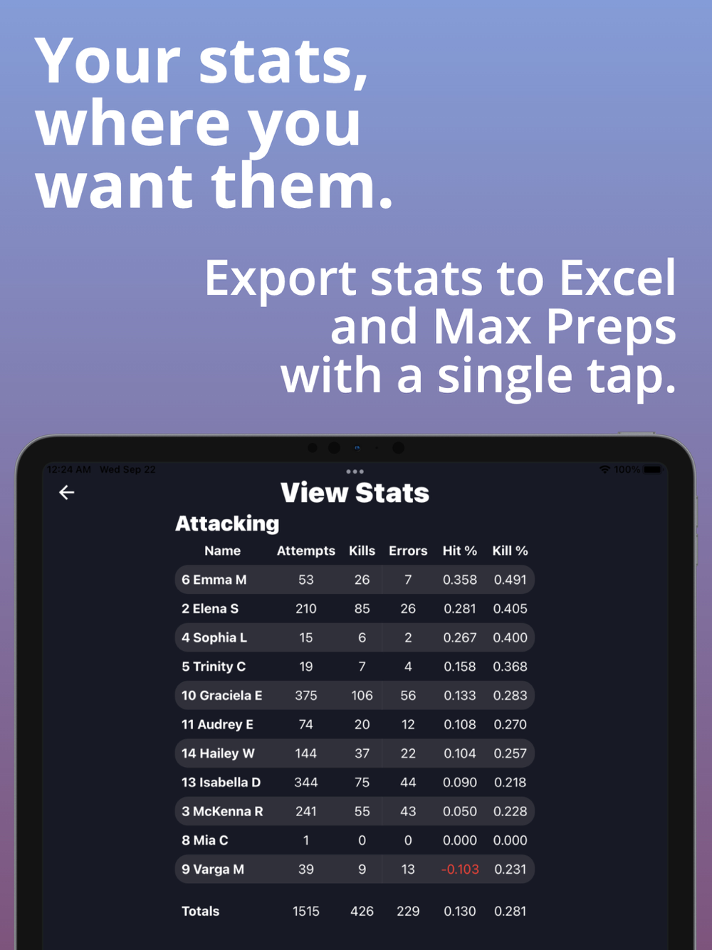 Unlike other apps where one person has to juggle every stat, Stat Together lets you get your team managers in on the action to make sure no swing, block, or dig gets missed. Everyone can stat on their own device at the same time and results are displayed instantly.