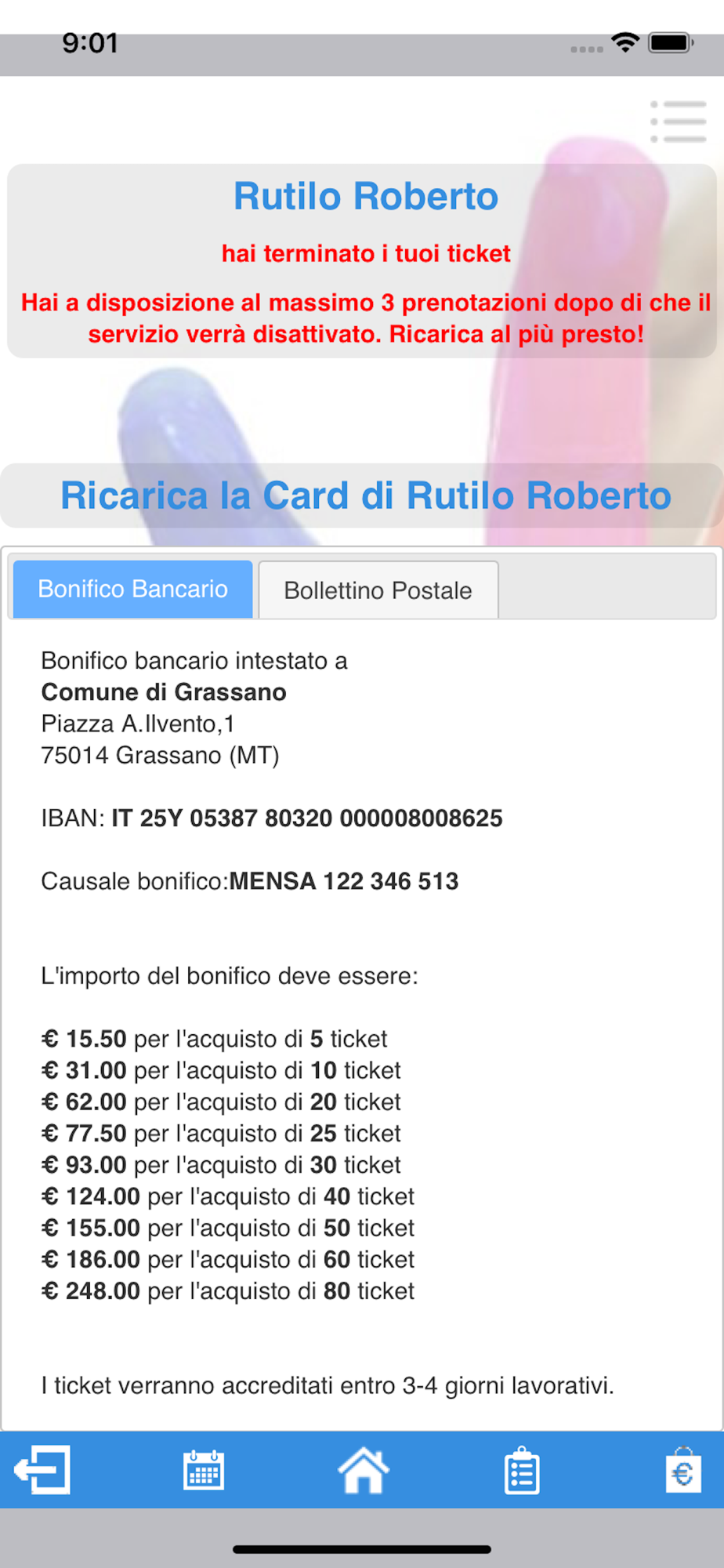 Attraverso l'app potrai visualizzare il menu del giorno, prenotare il pasto, consultare il saldo o ricaricare la tua card tramite carta di credito, PostePay o conto Paypal. Potrai inoltre richiedere l'attestazione di spesa per la detrazione fiscale.
