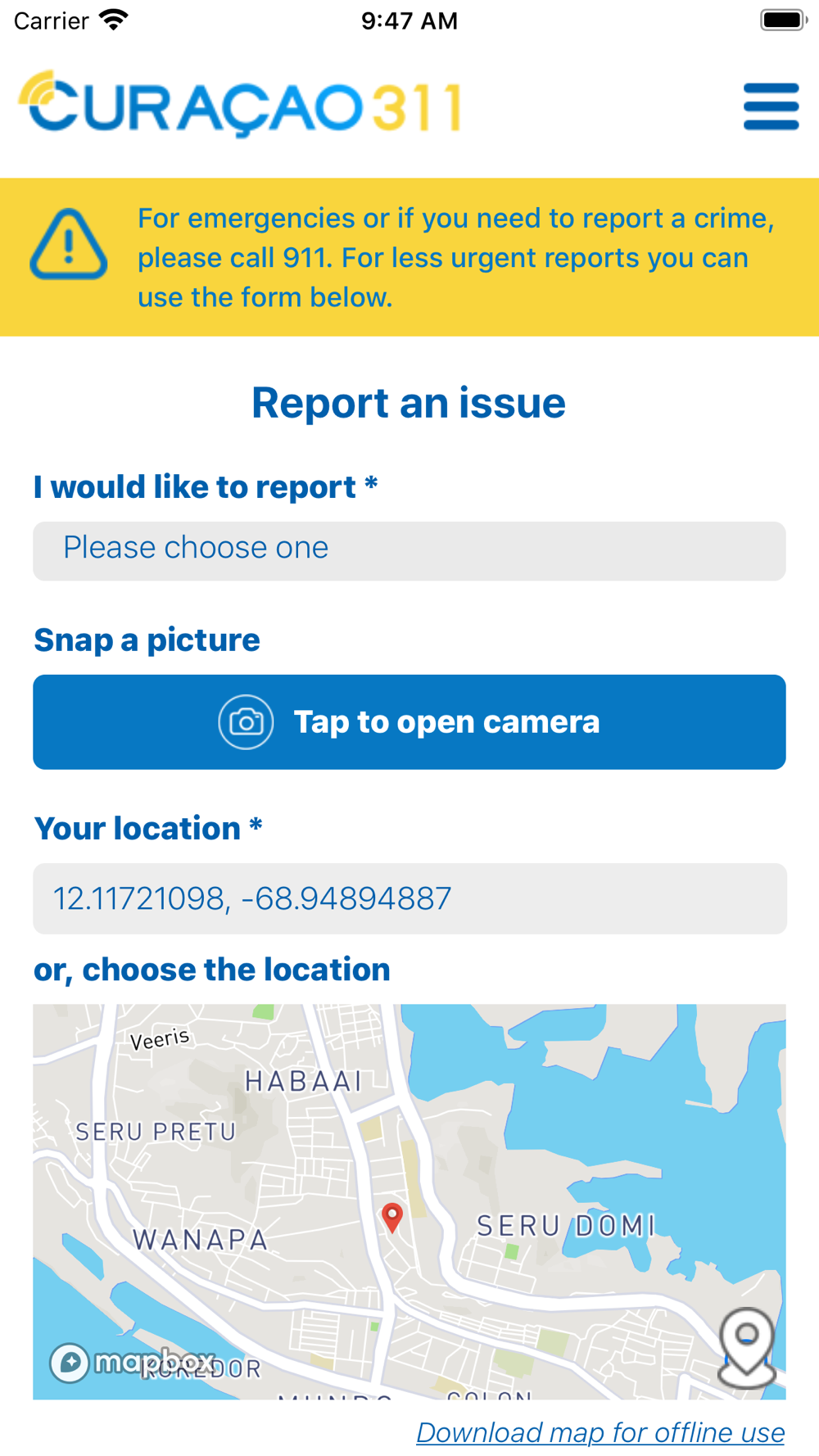 Curaçao 311 is a platform for citizens by citizens to help accelerate the application of solutions for our everyday problems. The first step towards solving a problem is to recognize, take notice, assess and document it. With the use of technology, it is now easier for all citizens to help gather important data and participate into this very first step towards bringing more solutions into our everyday lives. After all, it is up to ourselves to take care of this beautiful island we call home.