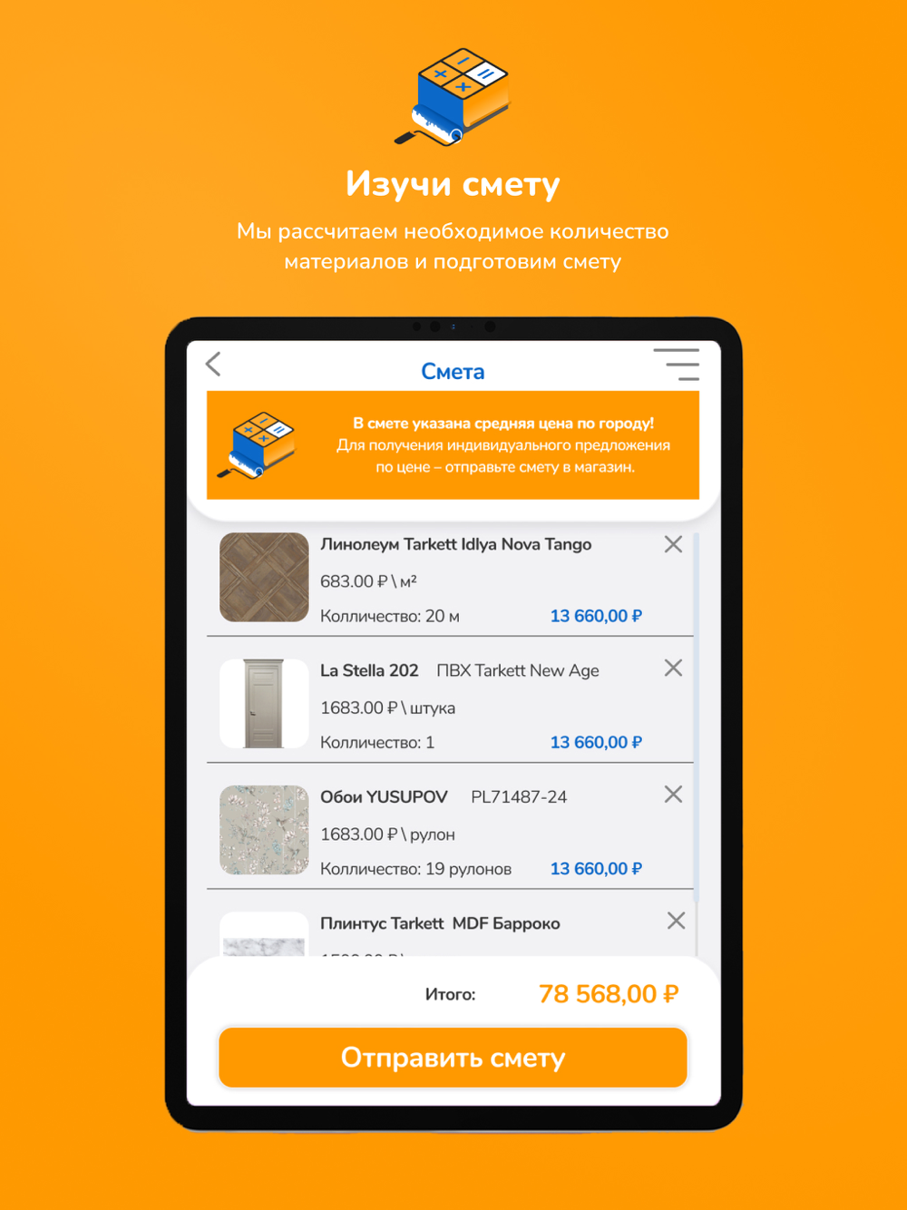 - Просмотр доступных магазинов вашего города с геолокацией и наличием материалов из сметы;