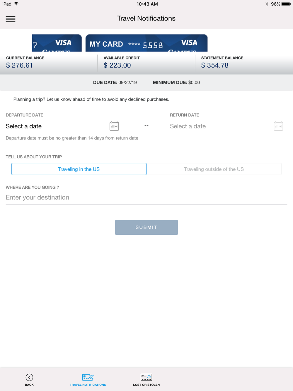 •Conveniently set travel notifications for peace of mind before you go