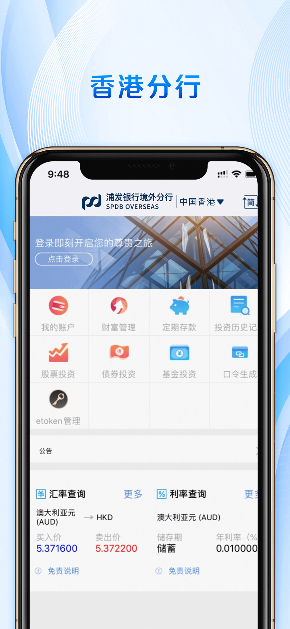 浦发银行全新发布浦发银行境外App,提供境外分行客户线上金融服务,使用最新的电子密码技术,配合网银可进行快速身份认证,公司及私人用户均可注册使用。支持个人账户和交易明细查询、存款和财富产品持仓查询、利率和汇率查询等金融功能,同时支持银行公告、用户服务条款及客服电话等内容的线上公示,为境外分行用户提供便利的数字化金融服务。
