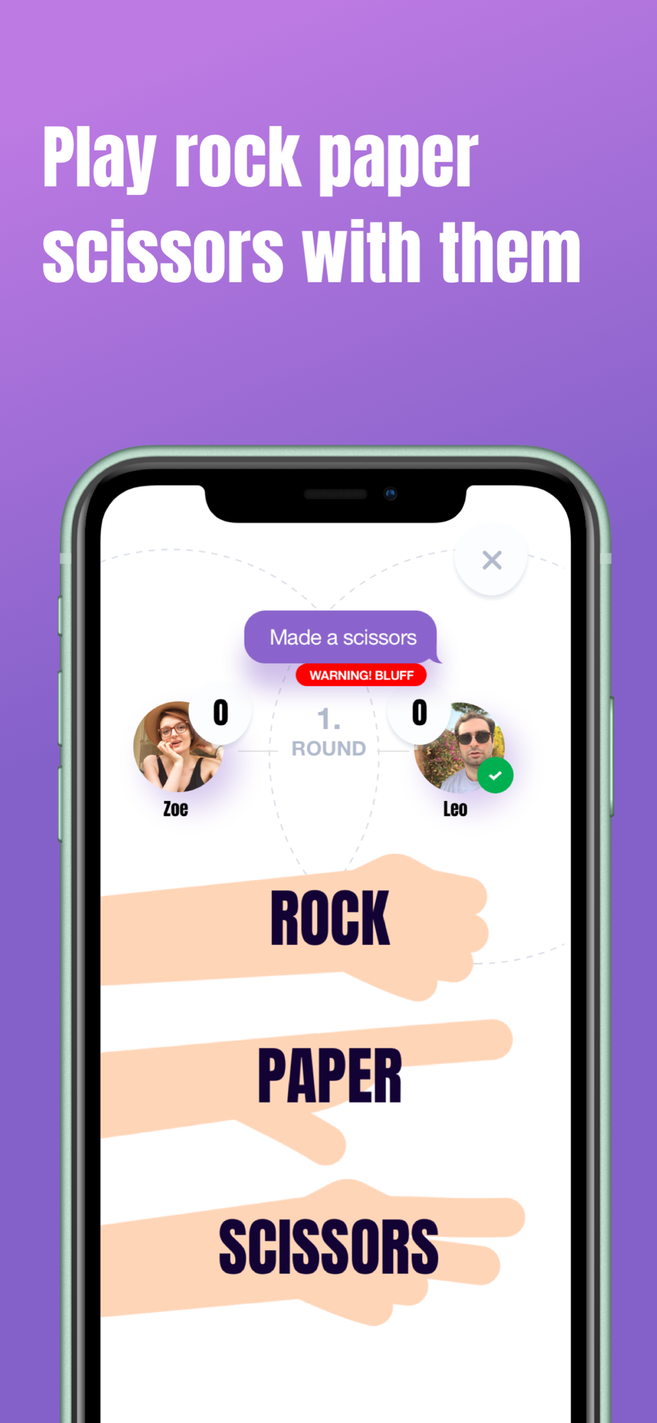 Play rock-paper-scissors with people around you, chat and make friends! To deceive your opponent, you can say your move beforehand. If your bluff is successful, you will get higher score. How many people in a row can you beat without being defeated? You will get points exponentially with your wins each time! Enter score board list in your city and start a conversation with people who see you on the score board and congratulate you, make friends or challenge them. Download for free, play, challenge nearby people now, win and chat with them!