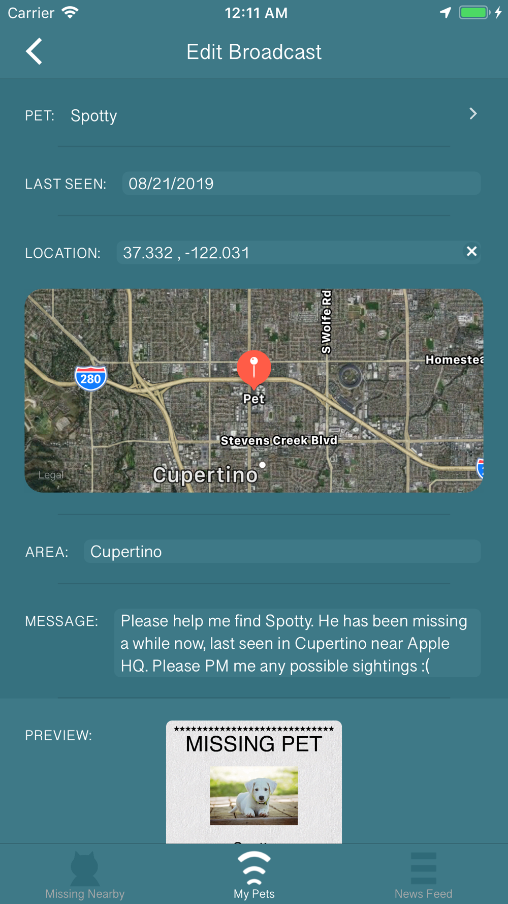 Should your pet go missing, everyone within your local area that has the app, will receive a notification within minutes of you reporting them missing.