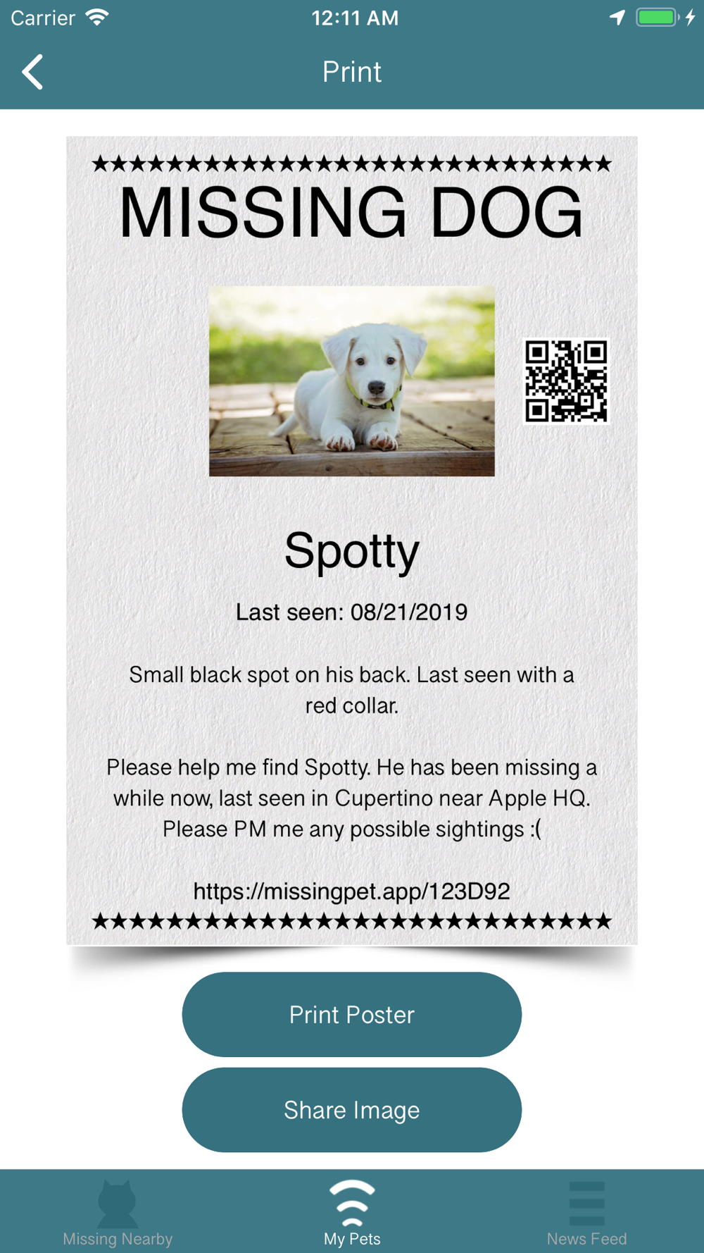 Pet owners can instantly print out posters with QR codes and easily share them with other social media platforms.