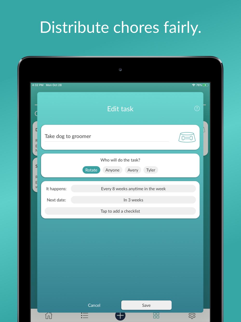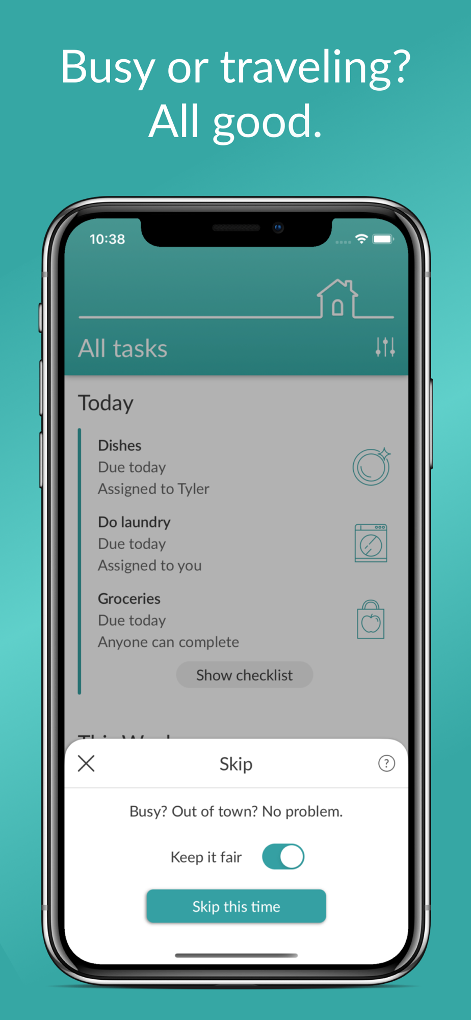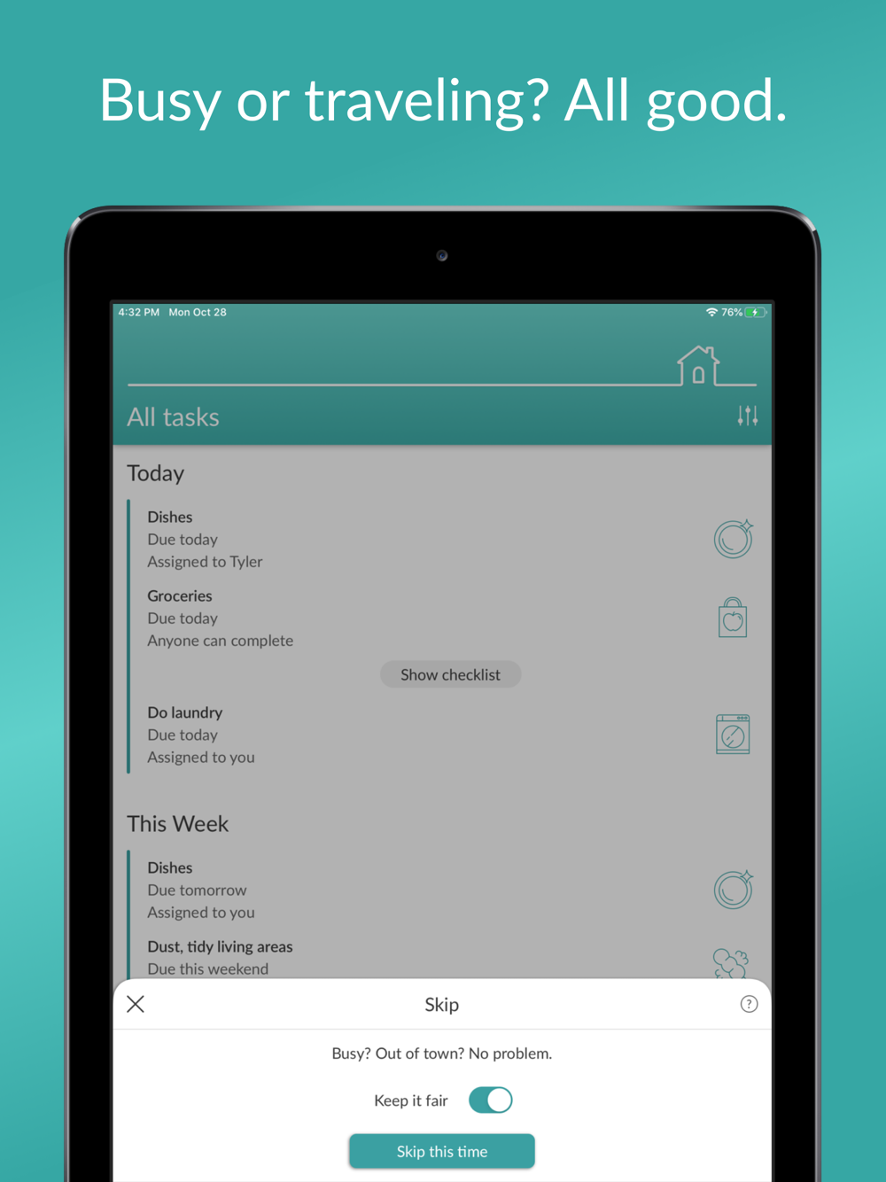 • Busy, out of town, or just can't? Skip, snooze, or reassign your tasks – and our "Keep it Fair" functionality automatically adjusts task distribution
