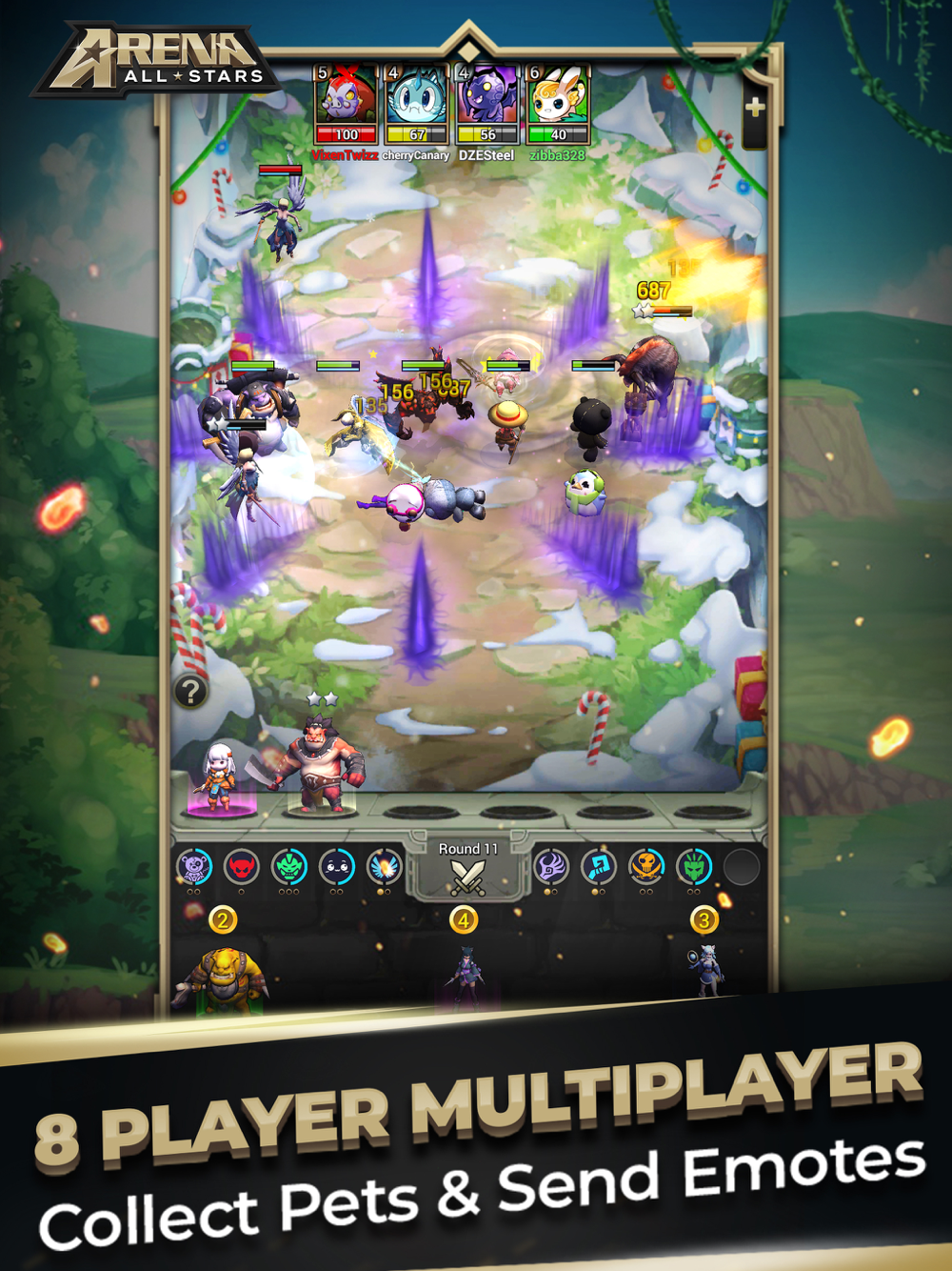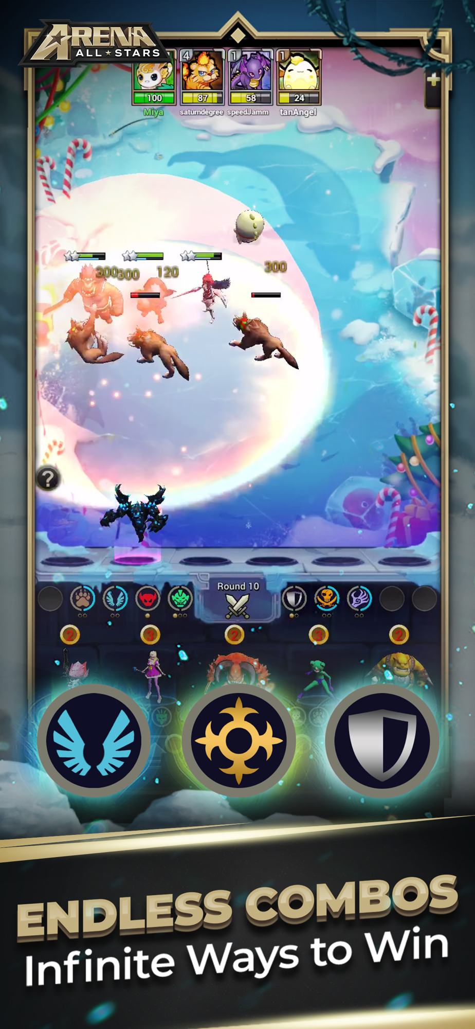 Arena Allstars adapts your favorite auto battler features and improves your mobile gaming experience in a couple of ways: (1) fast-paced action and shorter game rounds, (2) vertical orientation screen, (3) bigger characters/icons, and (4) optimized user interface and controls.