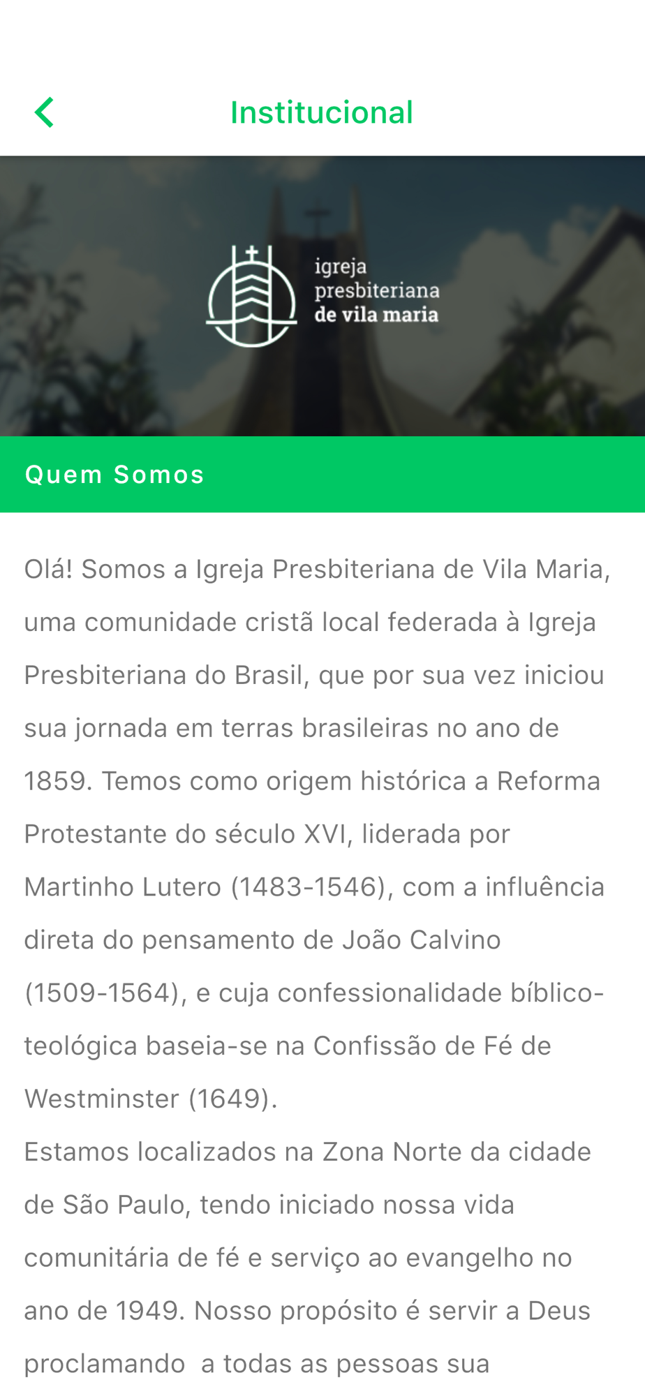 Seja muito bem-vindo ao aplicativo da IPVM (Igreja Presbiteriana de Vila Maria). Aqui você pode conhecer mais sobre nossa comunidade, suas programações, boletins, notícias, estudos etc.
