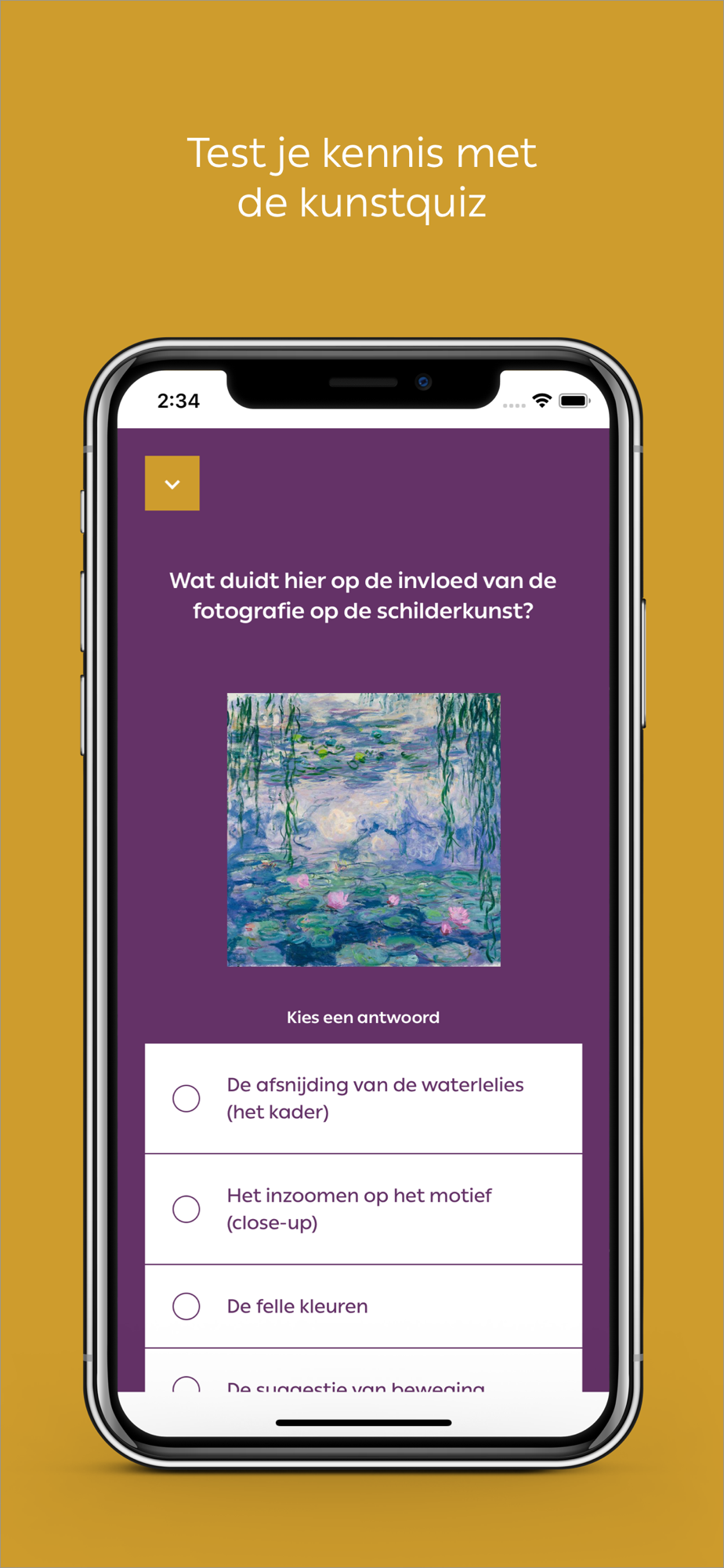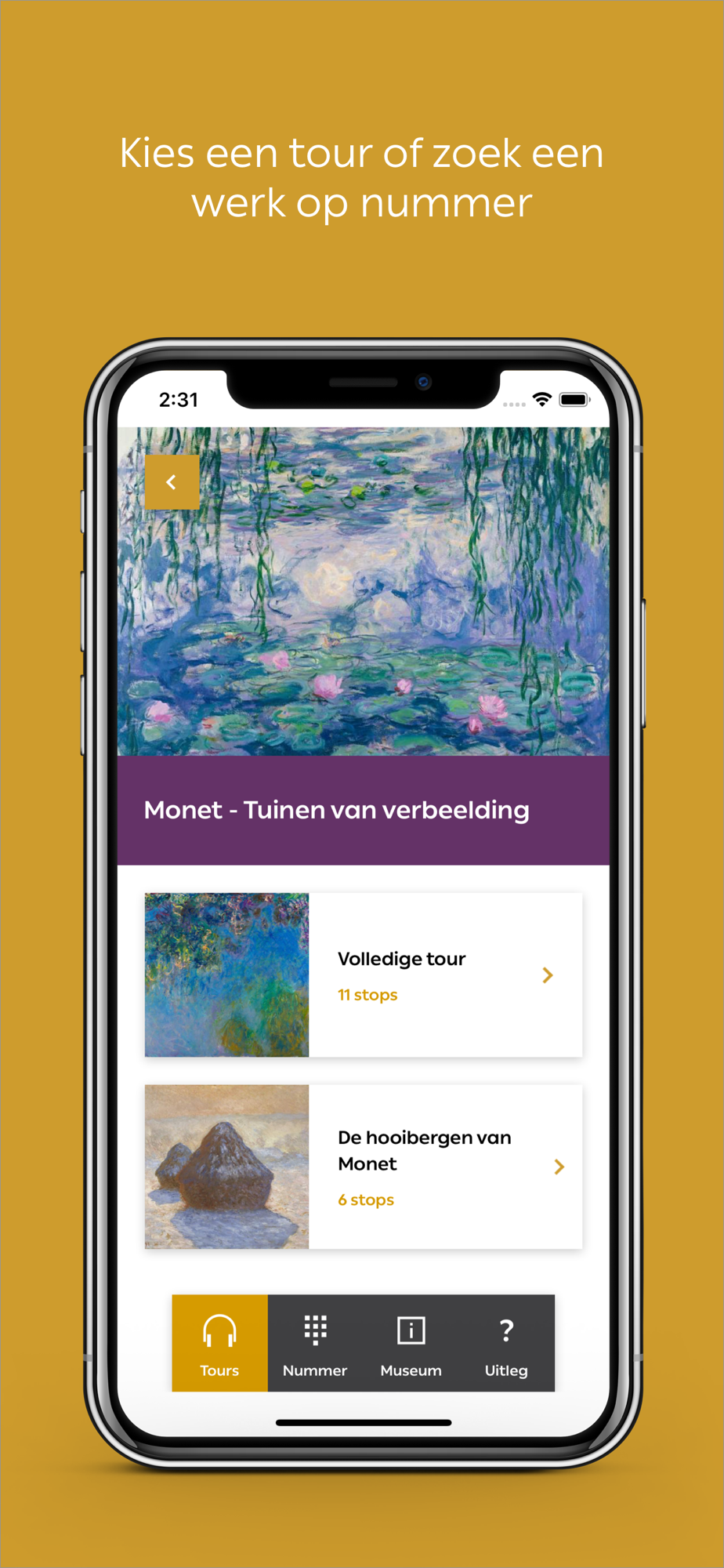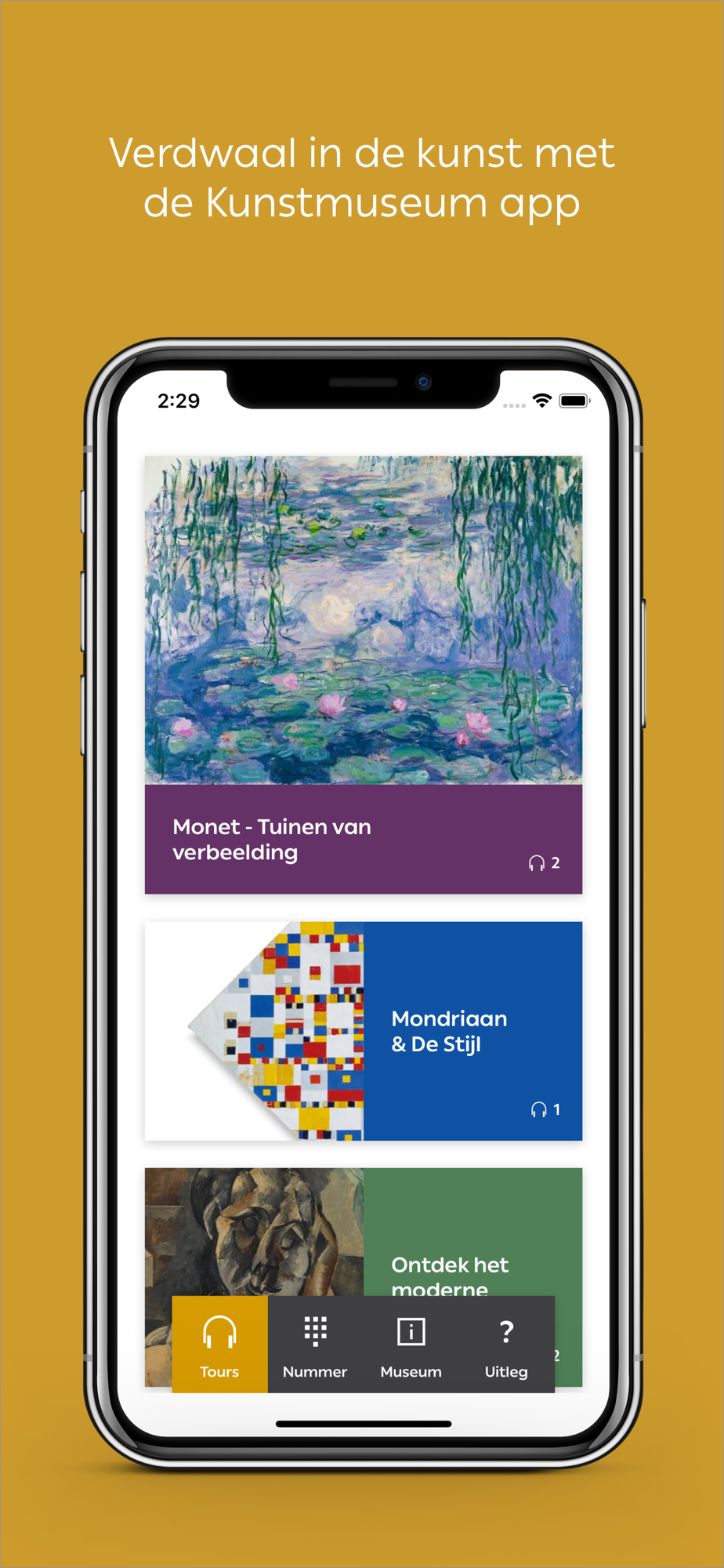 Om je te laten verdwalen in de kunst is er in het Kunstmuseum Den Haag geen duidelijke looproute. Je bepaalt zelf bij welke werken je dicht bij wilt komen. Kies uit actuele en vaste tentoonstellingen of zoek specifieke kunstwerken op nummer. Luister naar audiofragmenten, bekijk filmfragmenten en test je kennis.