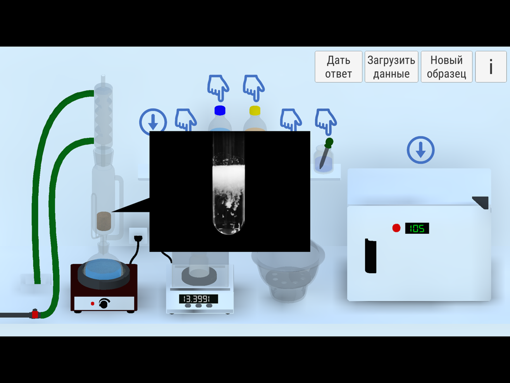 Приложение симулирует работу экстрактора Сокслета, сушильного шкафа, весов. Программа имеет встроенную методическую инструкцию и её удобно использовать как наглядное учебное пособие