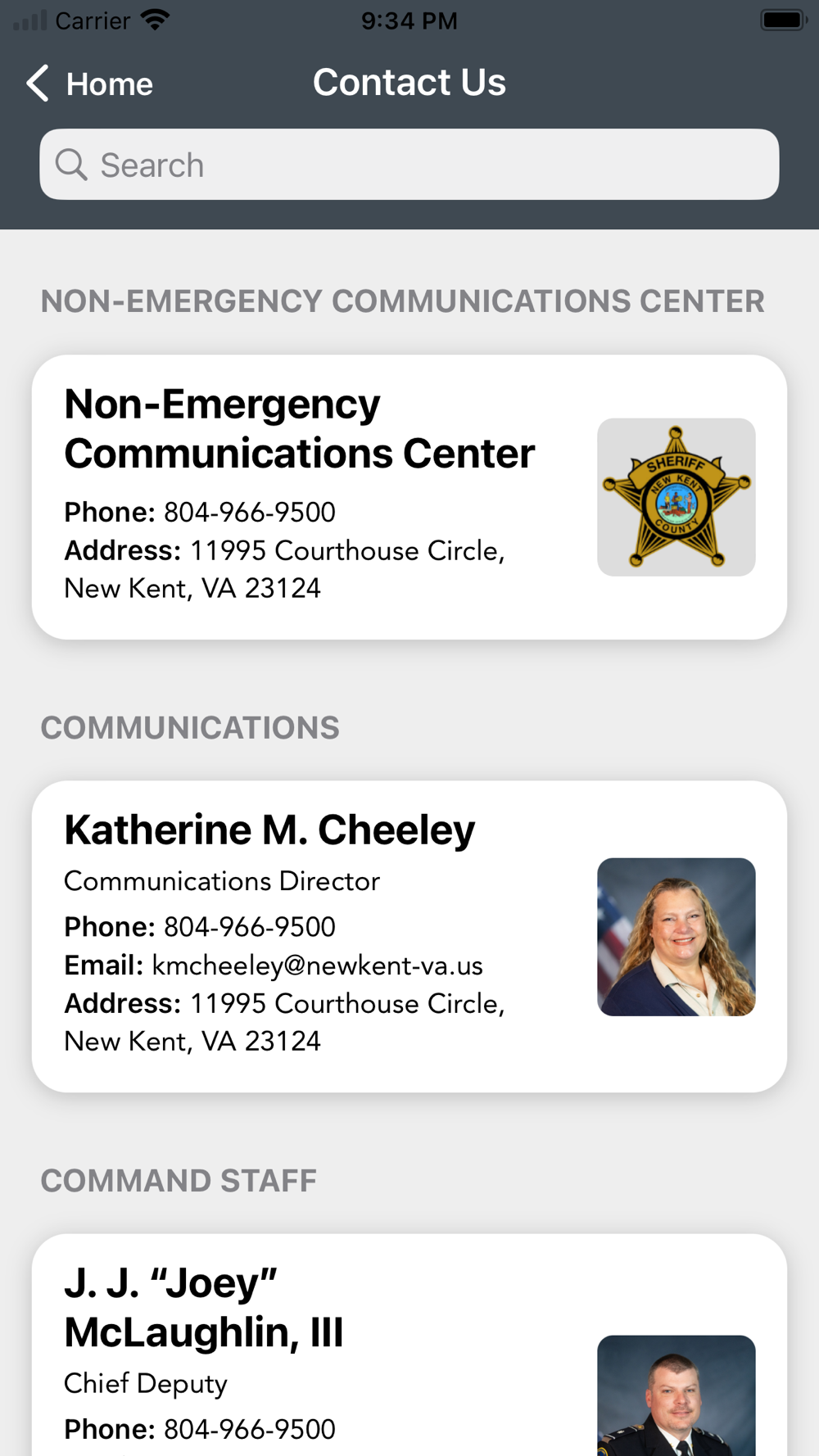 The New Kent County Virginia Sheriff’s Office mobile application is an interactive app developed to help improve communication with area residents. The New Kent County Sheriff App allows residents to connect with the sheriff’s office by reporting crimes, submitting tips, and other interactive features, as well as providing the community the latest public safety news and information.