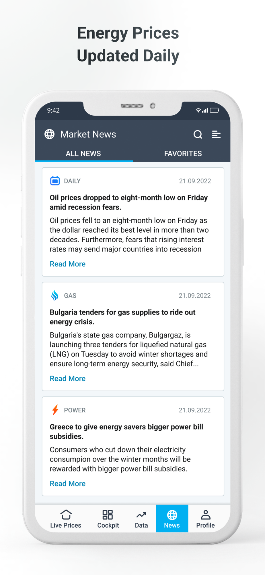 Access to millions of Energy Data and news updated Daily. Limited set of data and 7 days history for free. All news for free. Access the premium version to have access to all prices, historical data up to 5 years, personalised dashboard and triggers and alarms. Be updated automatically.