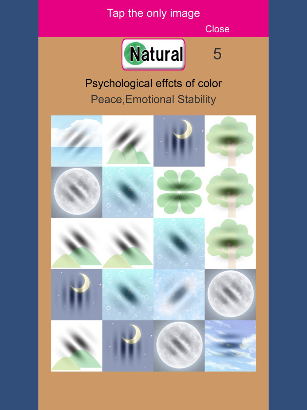 20 Gabor patch images are displayed. There are 5 single images in it. Tap all 5 to clear the game.