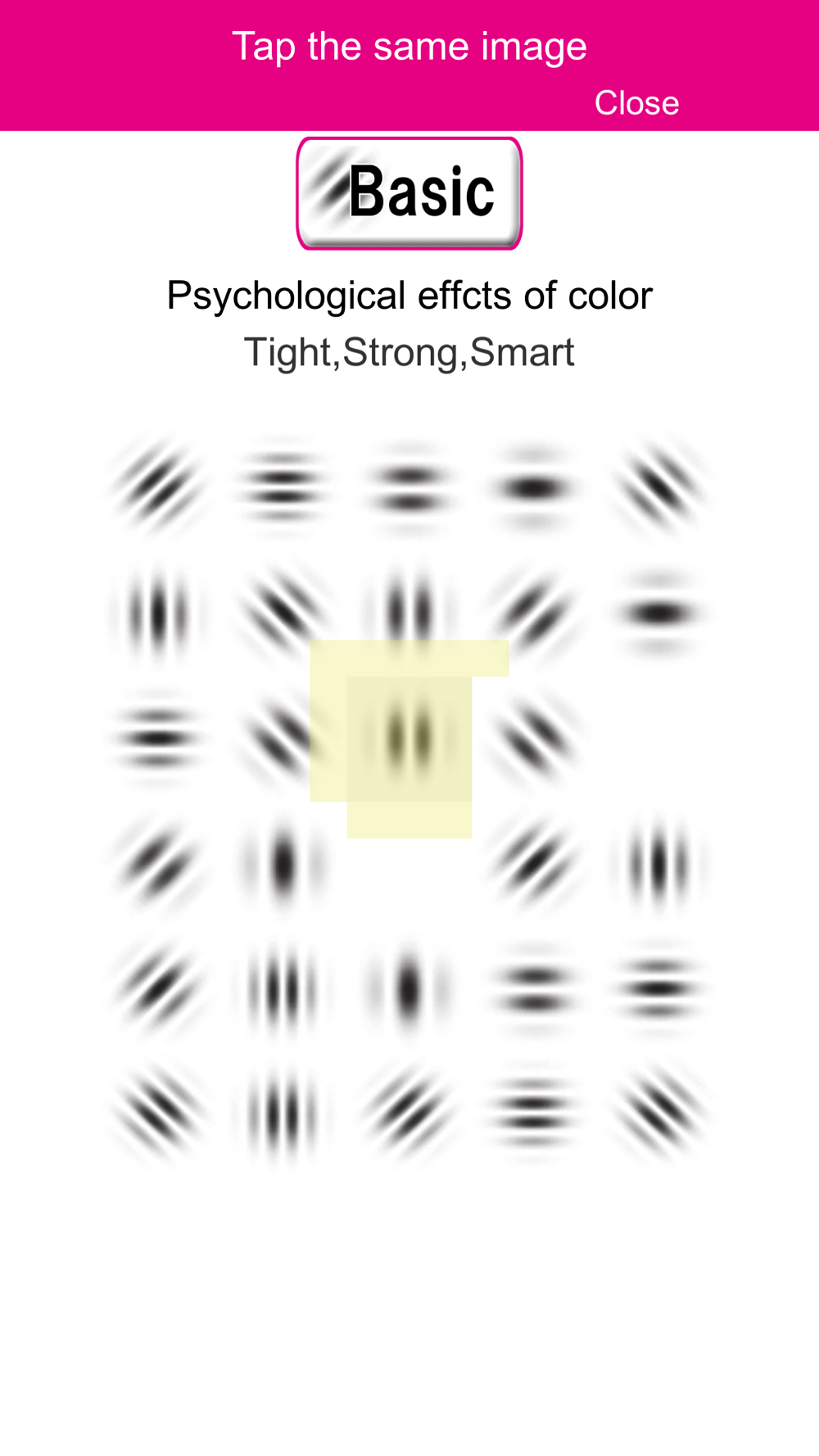 Tap on the Gabor Patch image with the same pattern to erase it, and a new screen will appear when all are erased.
