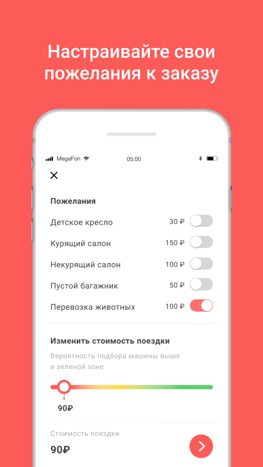 Вы заранее знаете расчетную стоимость поездки и даже можете ее увеличить, если хотите ускорить назначение машины и уехать быстрее.