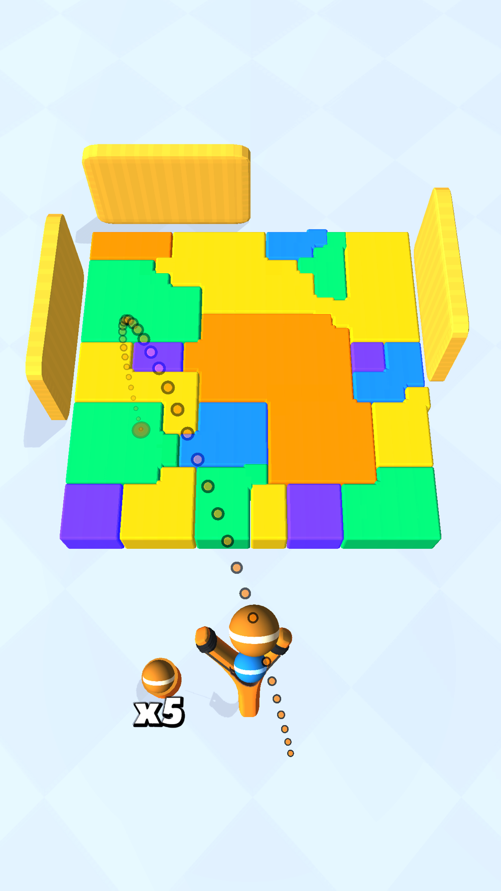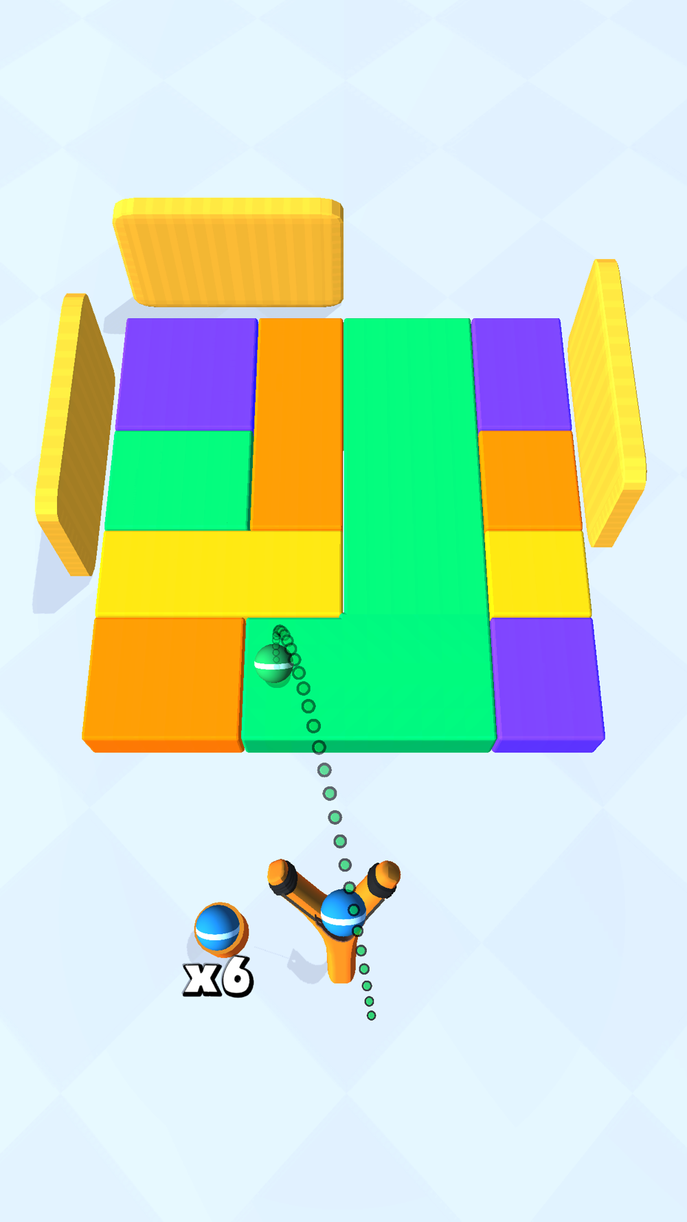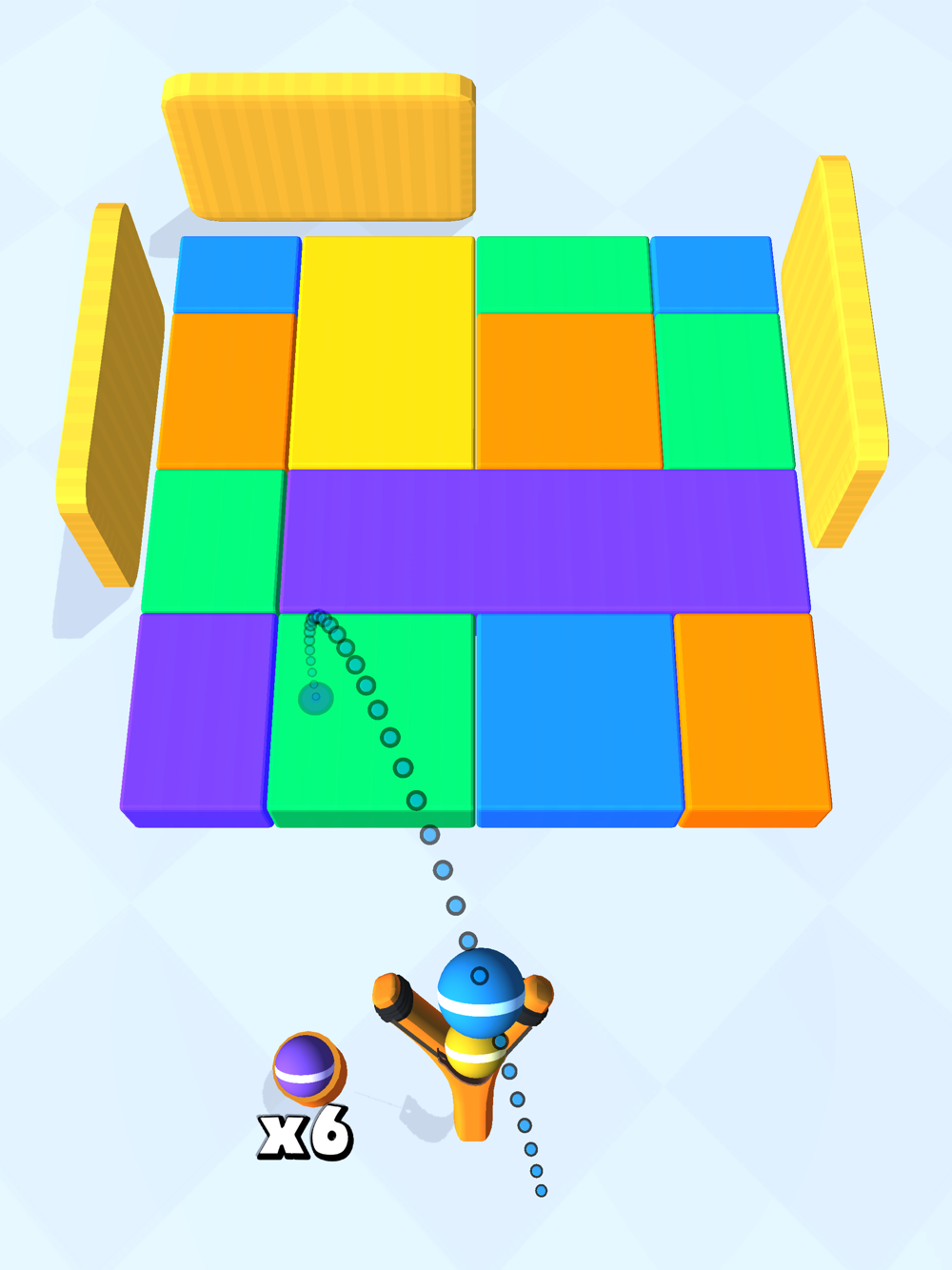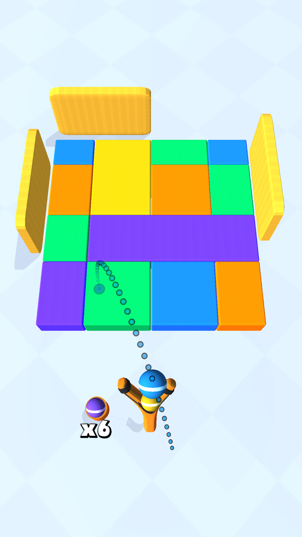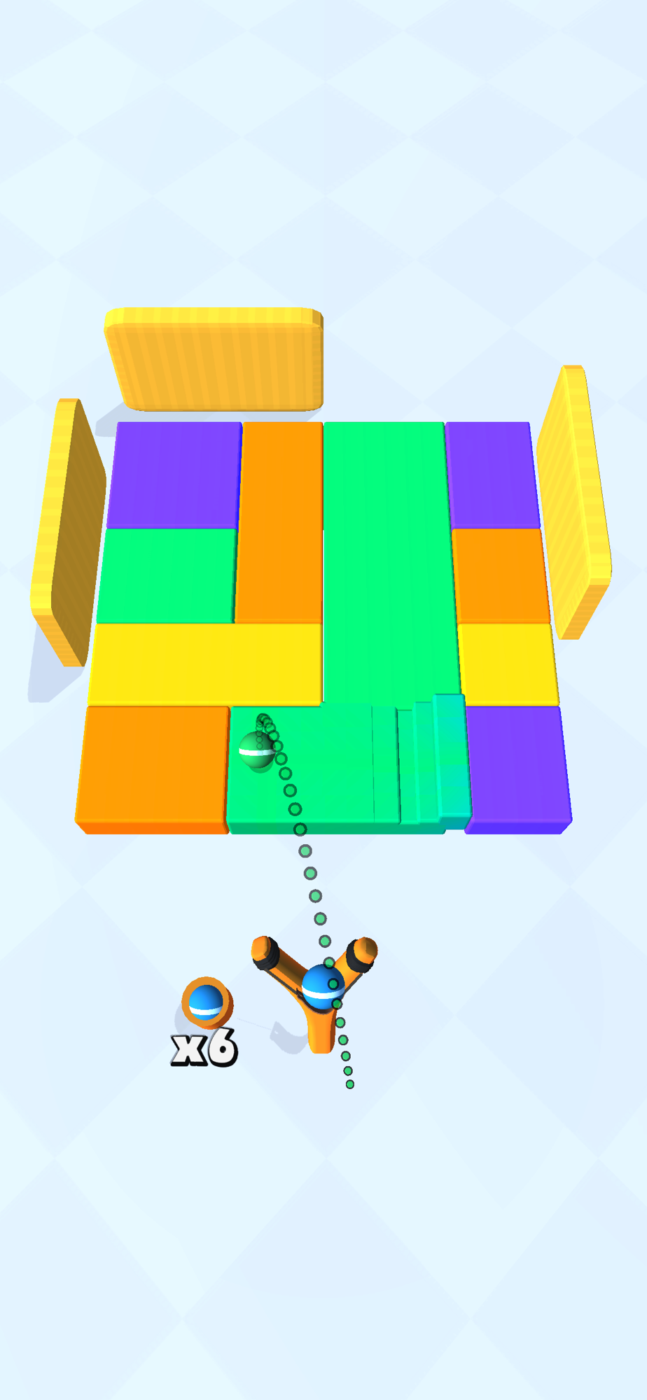 Drag to aim the slingshot, release to throw the ball at the cubes.