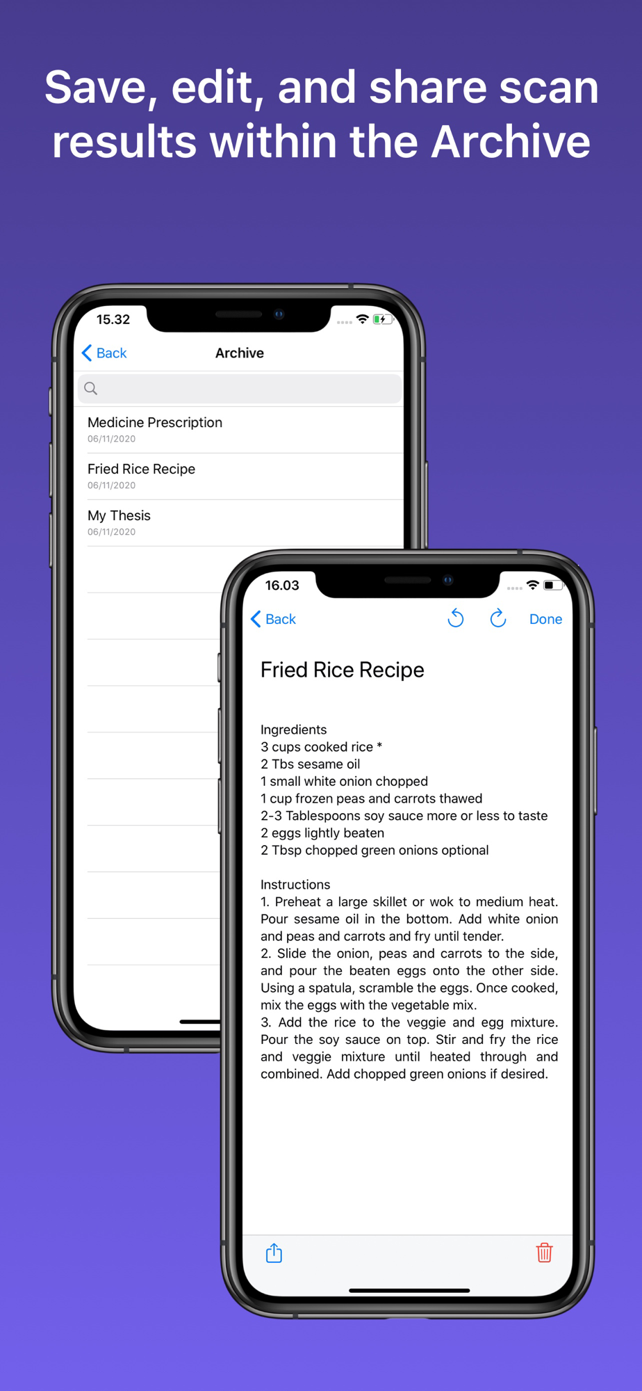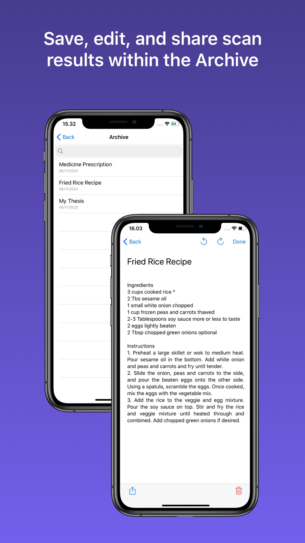Archive: The archive contains files of scan results that have been saved by the users. Users are able to share any files via WhatsApp, Line, Mail, etc. Users are also able to edit the content of the files and delete them.
