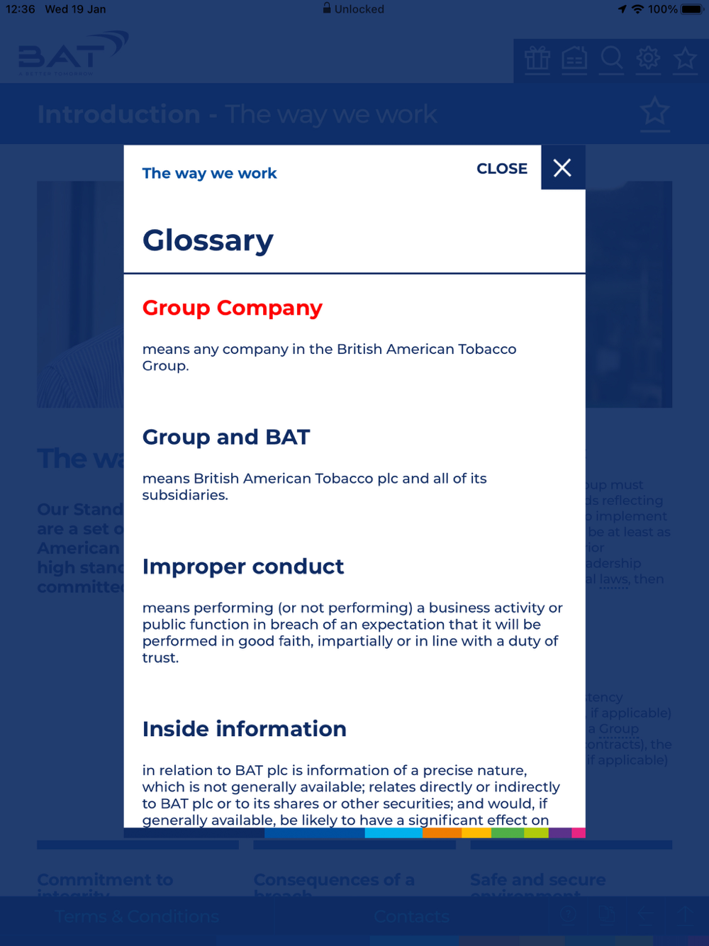 Our Standards of Business Conduct (SoBC) are a set of global policies of BAT, expressing the high standards of integrity we are committed to upholding. Our SoBC policies cover a wide range of areas including Speak Up, anti-bribery and corruption, gifts and entertainment, respect in the workplace, human rights, lobbying and public contributions, data privacy, confidentiality and information security, anti-tax evasion and anti-money laundering, sanctions and export controls, and many others.