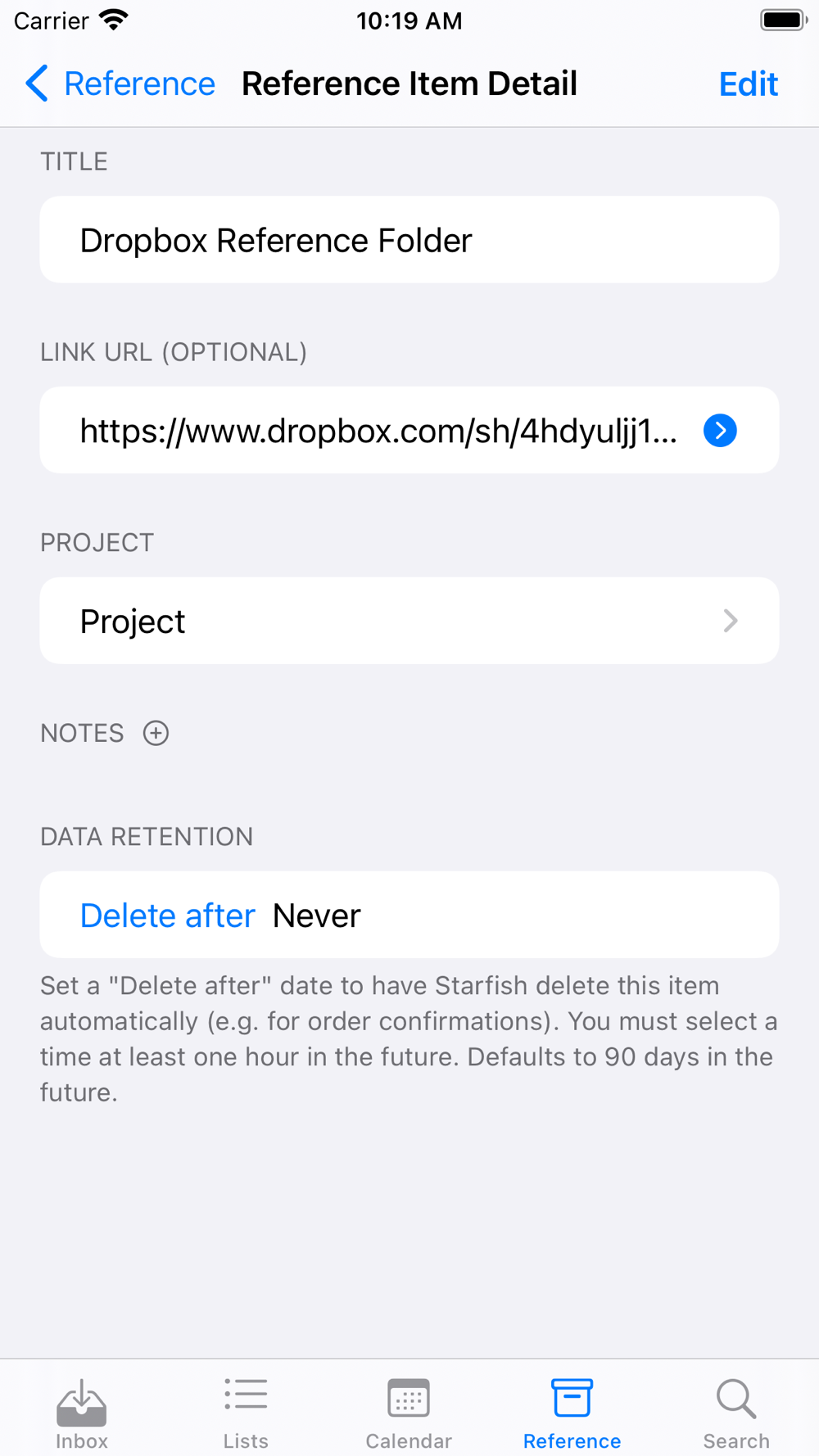 - Add notes to inbox items, actions, projects or reference items - Starfish auto-timestamps them for you.