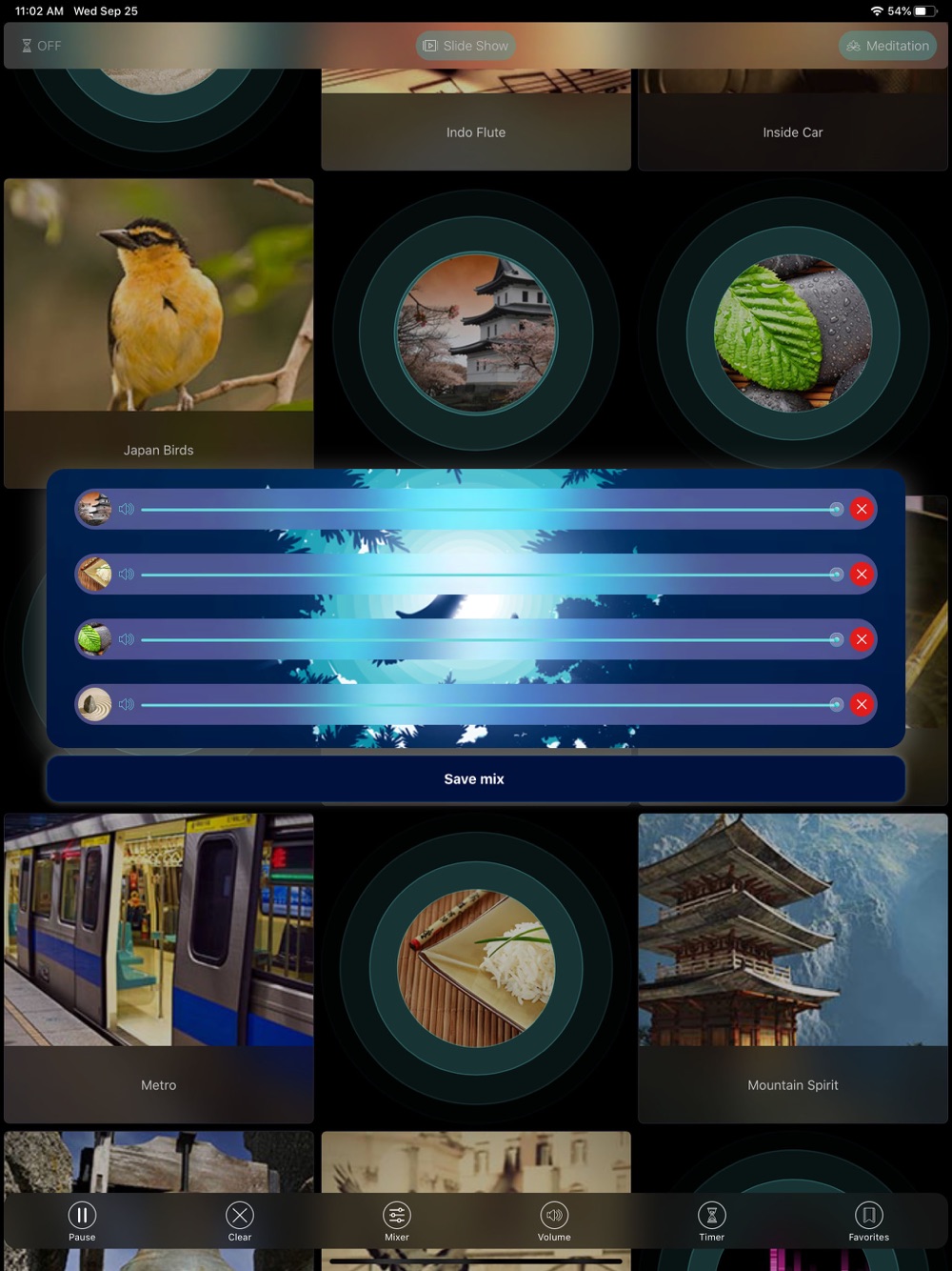 - Create your own ambience mix by combining sounds and music to relax