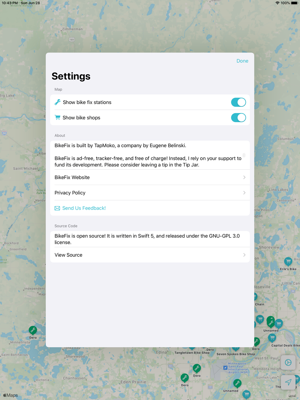 BikeFix is the easiest way to find nearby bicycle repair stations and shops when you're on the trail! BikeFix taps into OpenStreetMap data for repair stations and shops anywhere in the world, and provides you with information including precise location, notes, phone, website. Plus, you can even open any bike station or shop directly in Apple Maps or Google Maps!