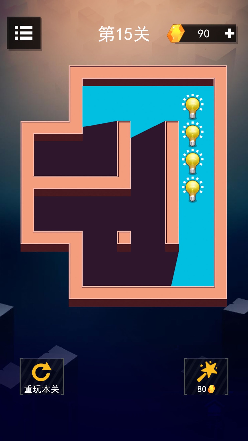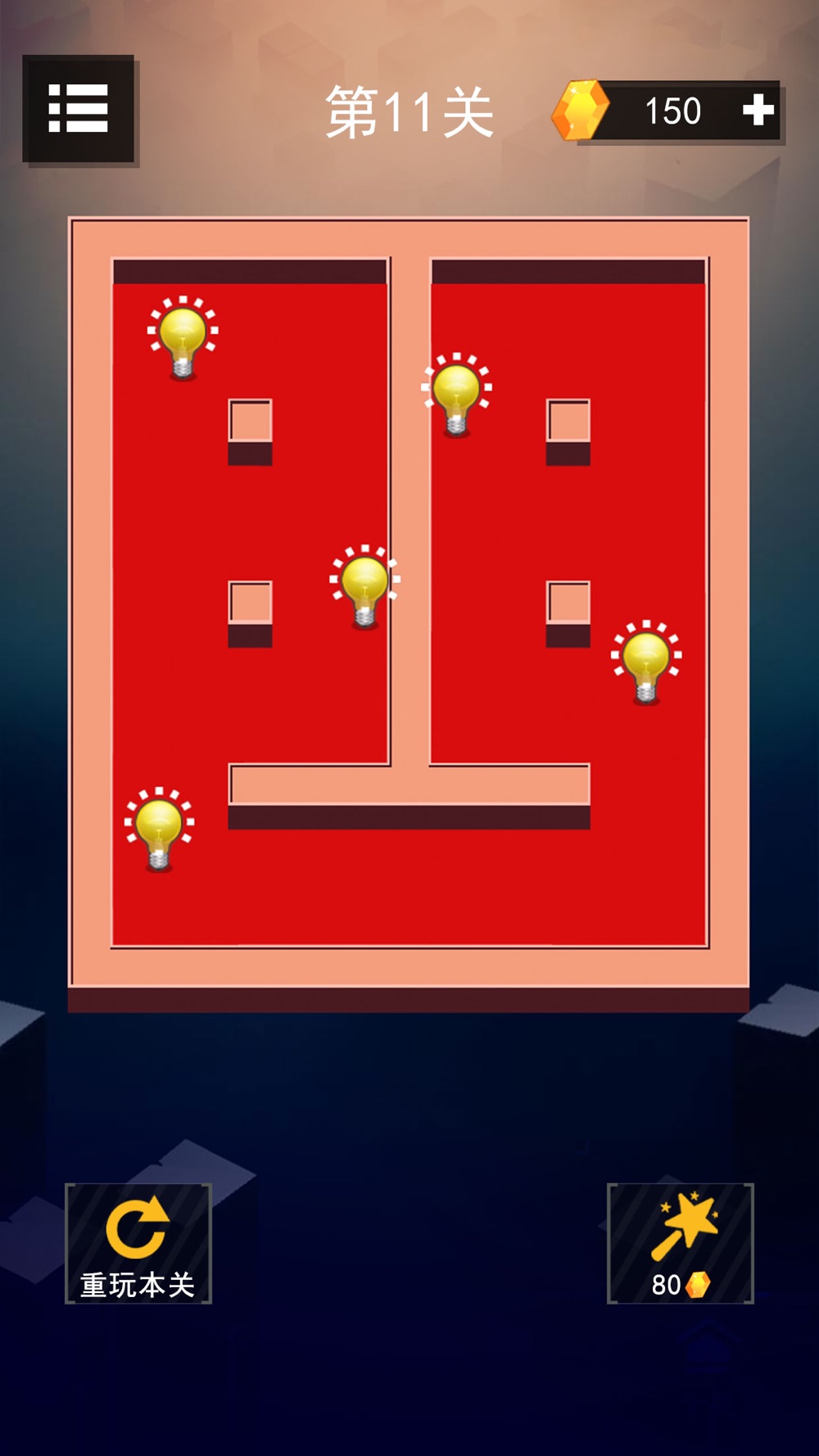 用手指拖动灯泡到合适位置,使所有的灯泡可以照亮房间每一个角落。需要注意的是房间内障碍物的位置,它们会遮挡一部分的光。