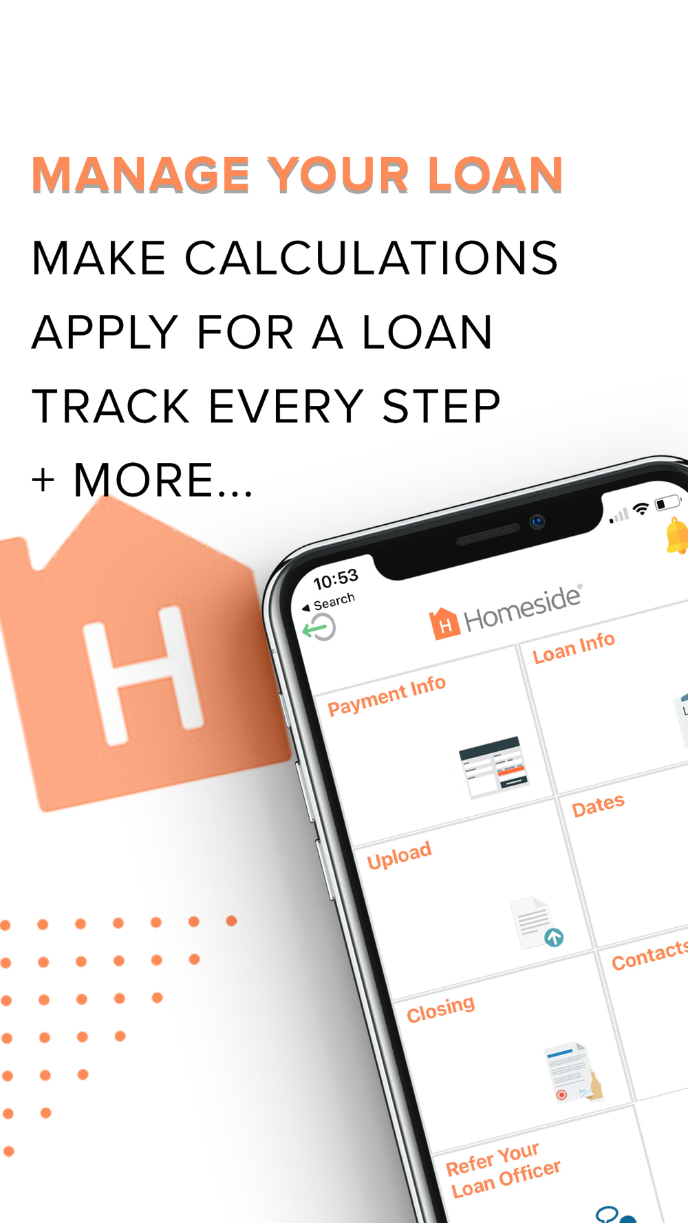 The Homeside Financial mobile app allows consumers, real estate agents and loan officers the ability to track their loan, receive real time updates and submit conditions via their mobile device. Users are able to verify loan information and status, receive push notification reminders for important dates (appraisal, loan commitment, closing, rate lock etc.), initiate a chat and remain engaged from origination to close.