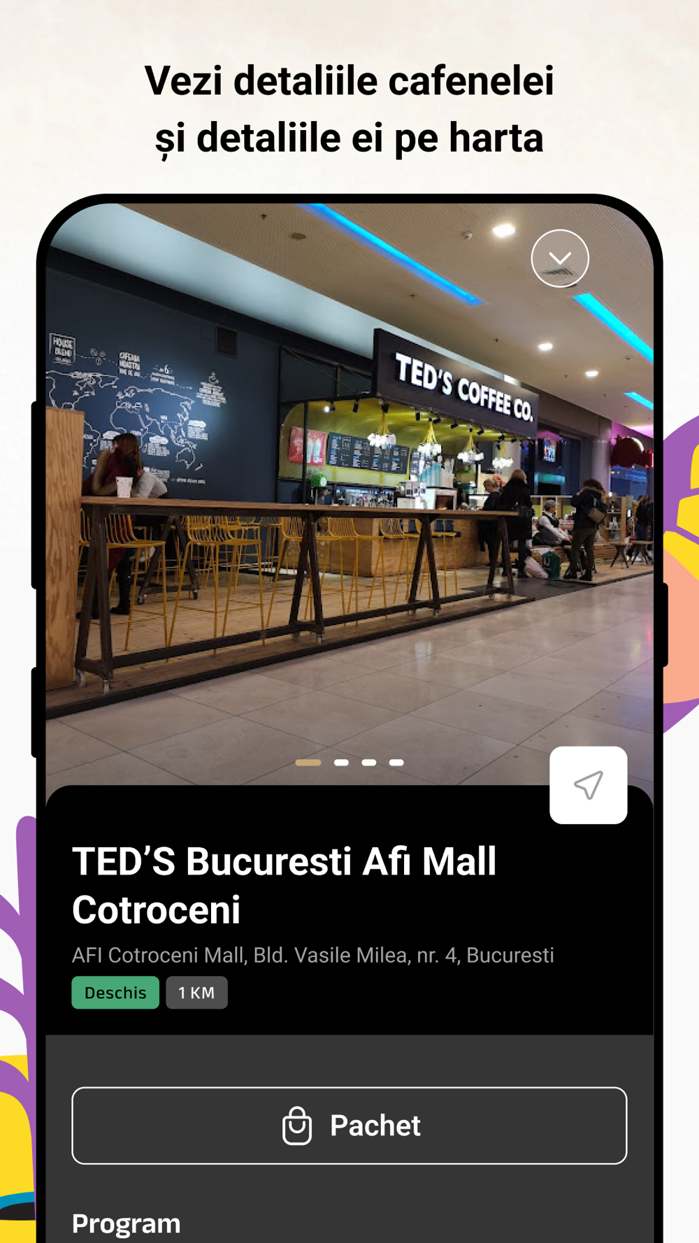 - Oferte si locatii. Esti mereu la curent cu noile oferte si beneficiezi de informatii legate de cea mai apropiata cafenea, distanta, adresa, harta si programul acesteia.
