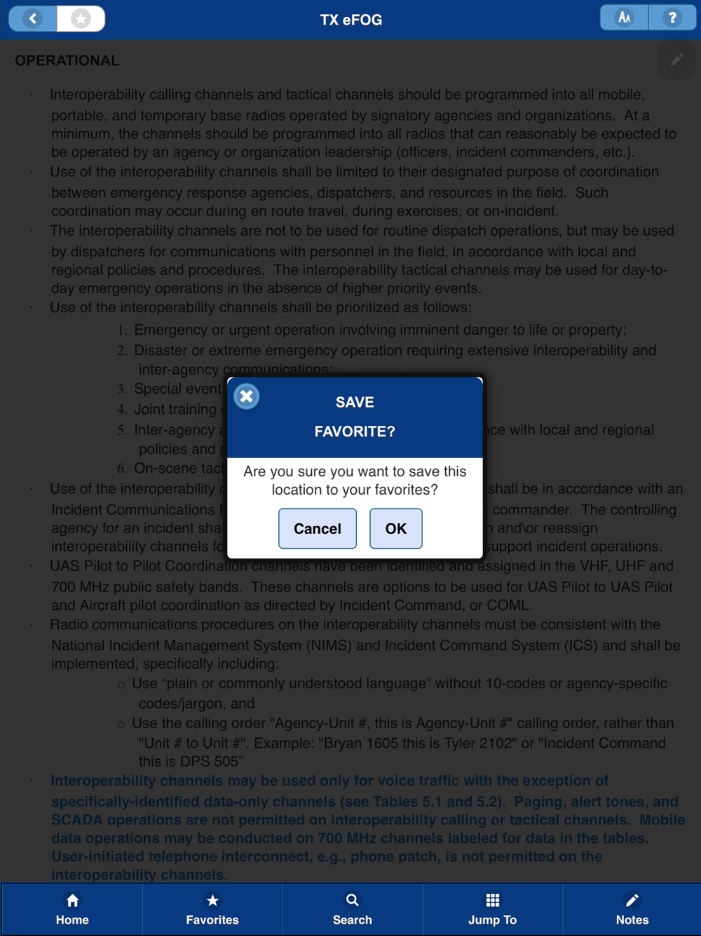 The TX eFOG mobile app gives users easy access to public safety communications information, offering a content index with links for quick jumps to reference sections, tables, figures, or images. The ability to save Favorites and create in-line notes enables personalized access to critical information. TX eFOG can be downloaded and then taken to the field as an offline reference, to be used without the need of an Internet connection.