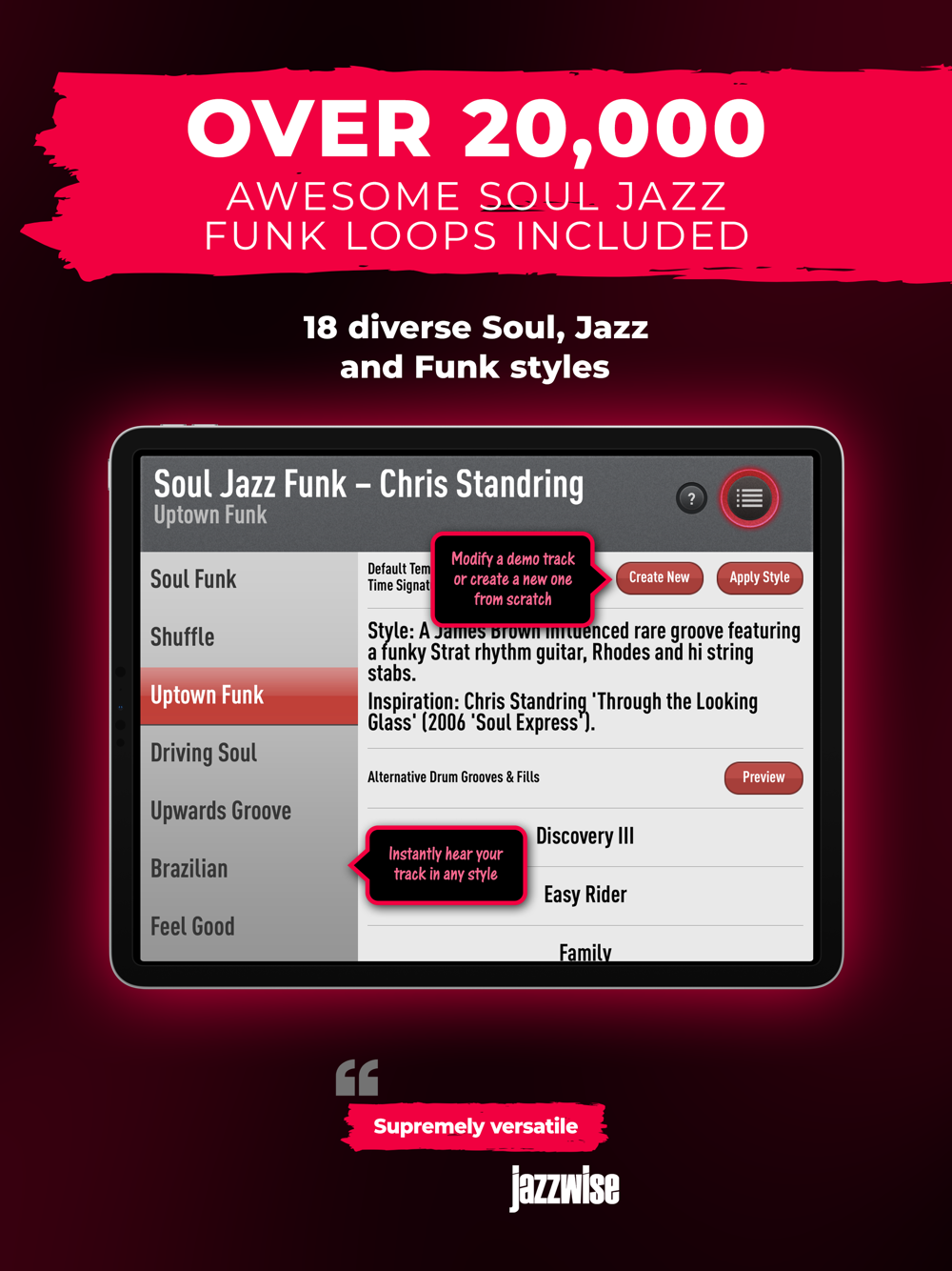 • 18 Soul, Jazz and Funk styles in tempo order: Smooth Jazz Ballad; Slow Groove Ballad; Gospel12/8; Motown Wah; Pop Fusion; Pop Soul; Swinging Reggae; Wah Funk; Electric Bossa; Samba Funk; Soul Funk; Shuffle; Uptown Funk; Driving Soul; Upwards Groove; Brazilian; Feel Good; Drum'n' Bass
