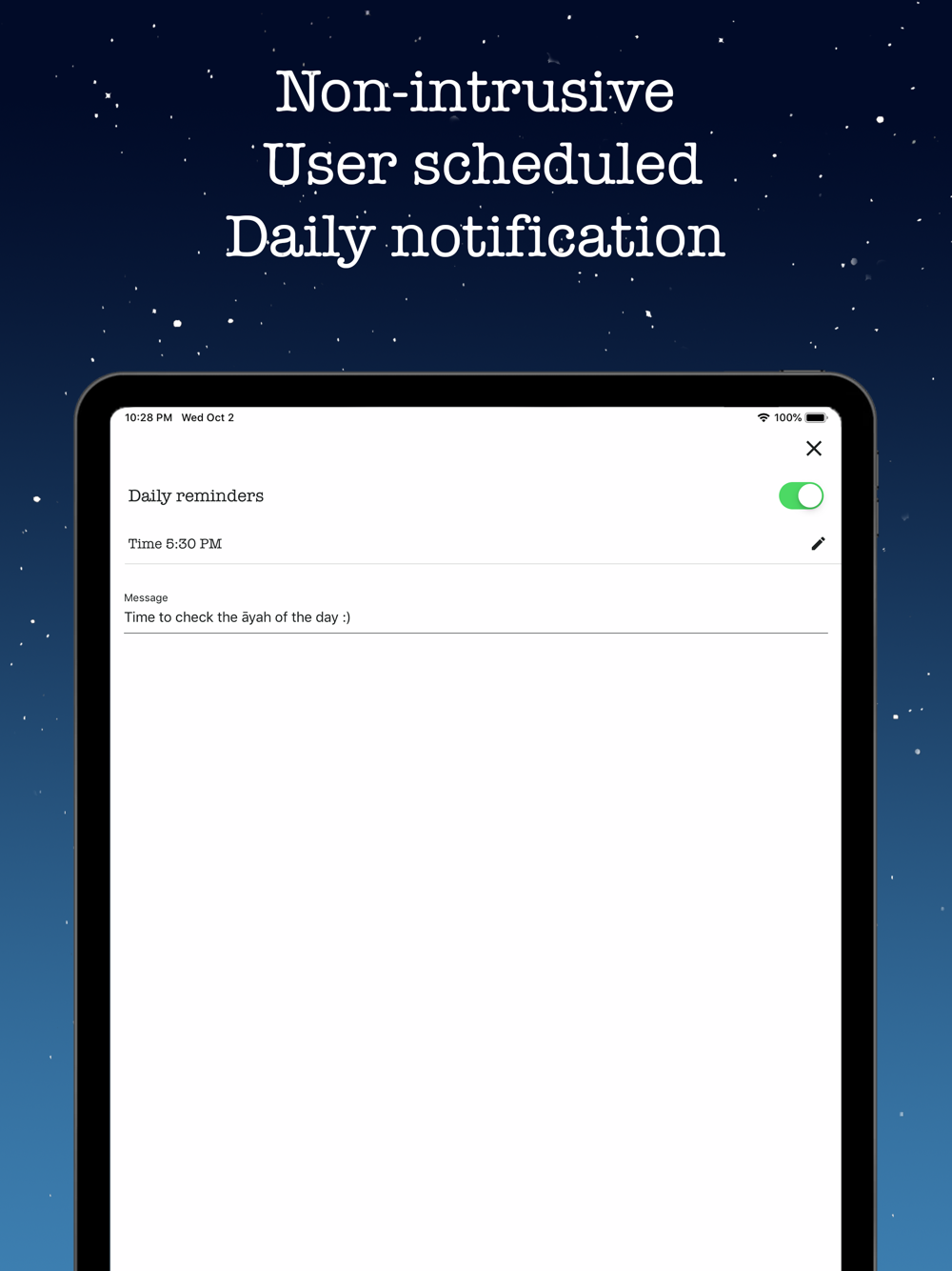 • Non-intrusive, user scheduled, daily notification of your scripture