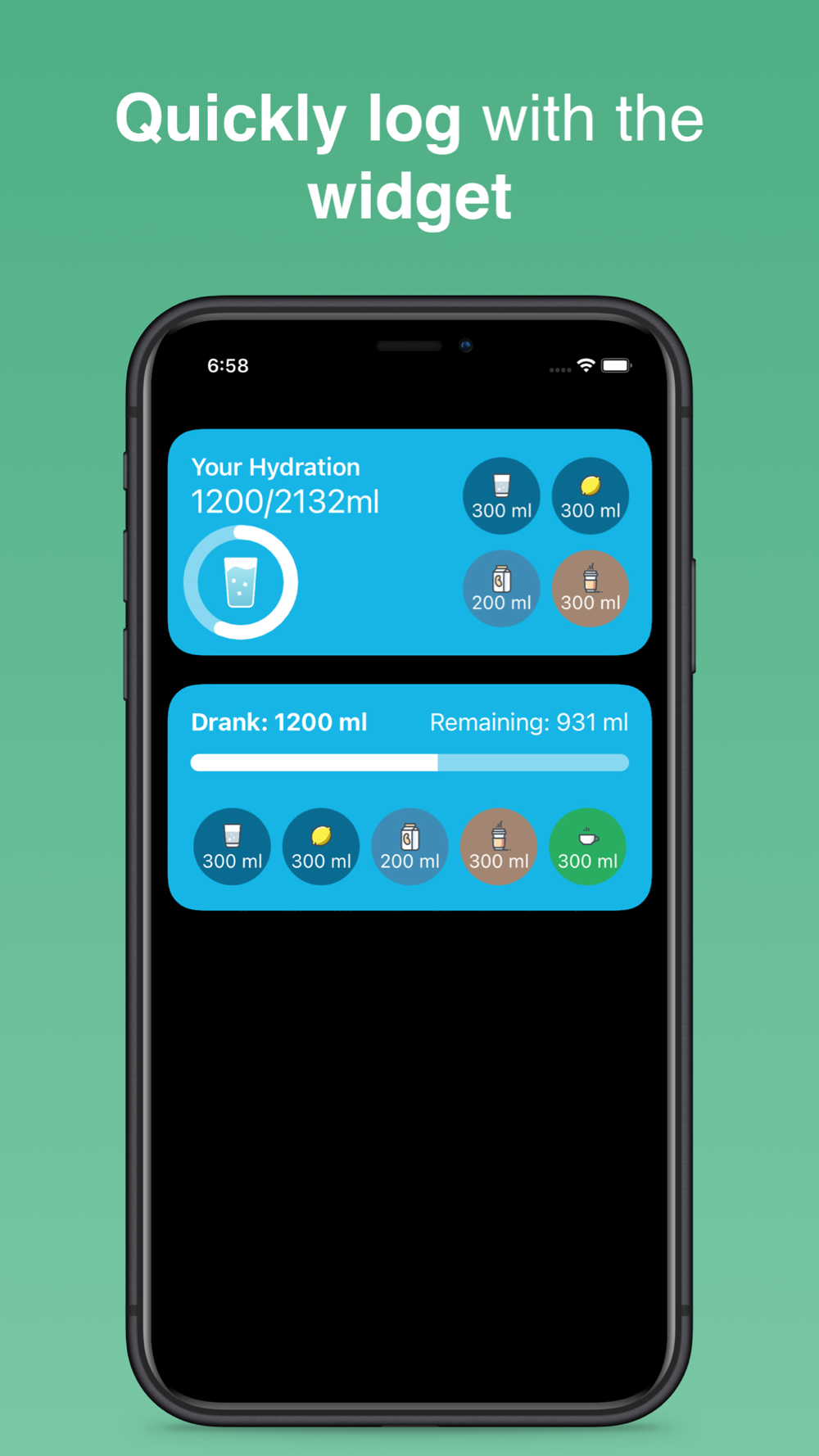 In the widget, you can also log your own created drinks and have an overview of your goal and the water you have already drunk.