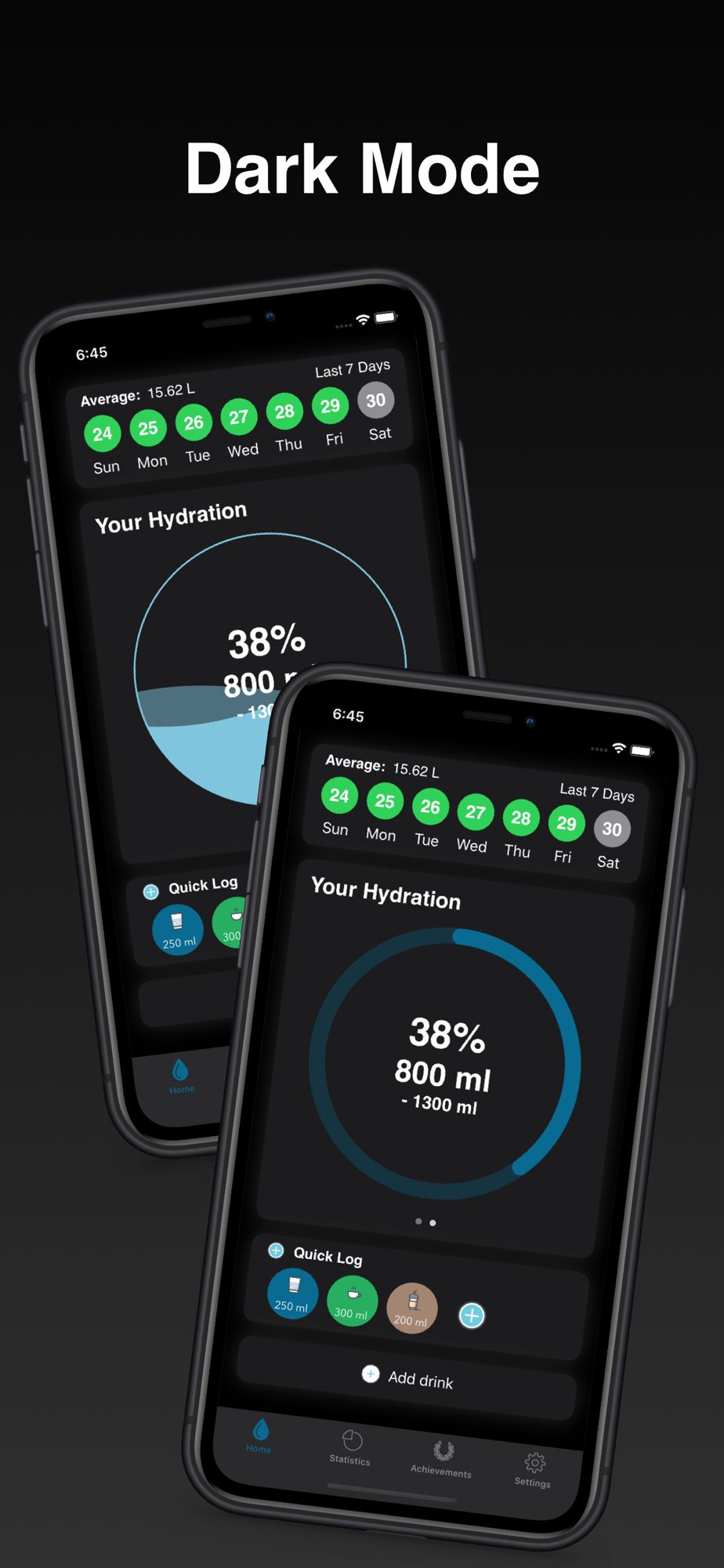 A beautiful line and pie chart visualise your water intake. How much water did you drink this month? What are your most logged drinks? Are you drinking less water this week than the last week? How often did you achieve your goal this year? You will find the answer in the statistic section in Drinkit.