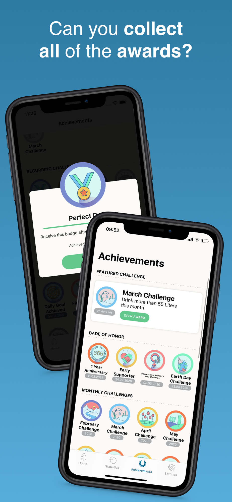 You can earn different awards and compare them with your friends. Log your water every day and start collection awards today!