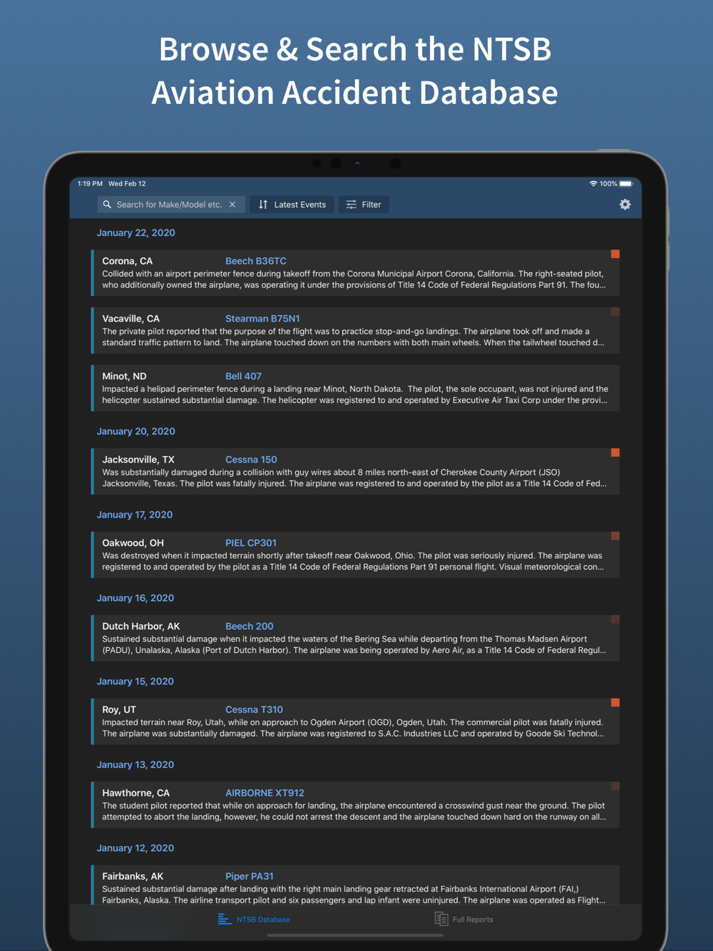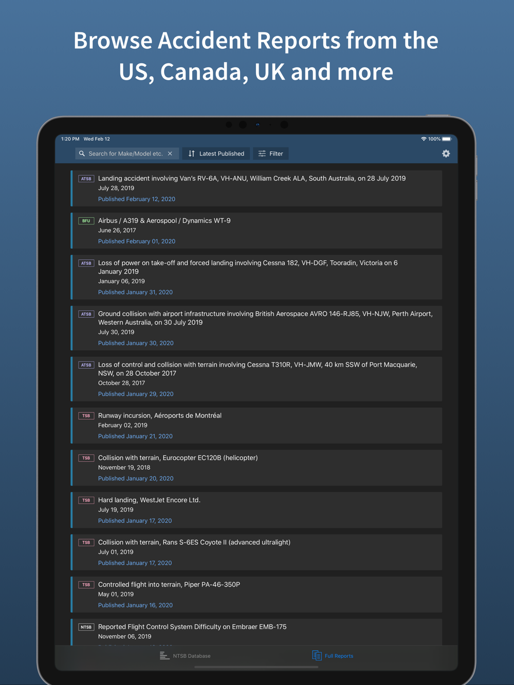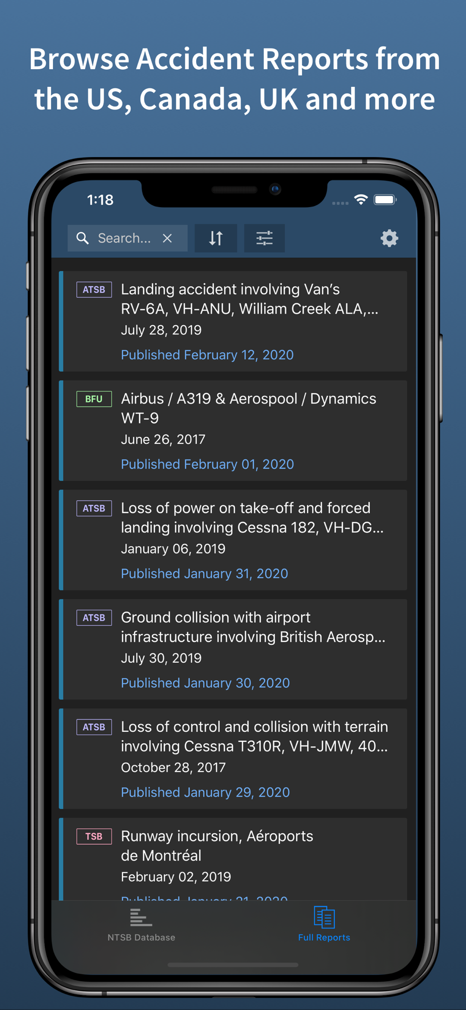 Aviation Accidents gives you in-depth access to US and international Aviation Accident Reports on your iPhone and iPad. One-week free trial.