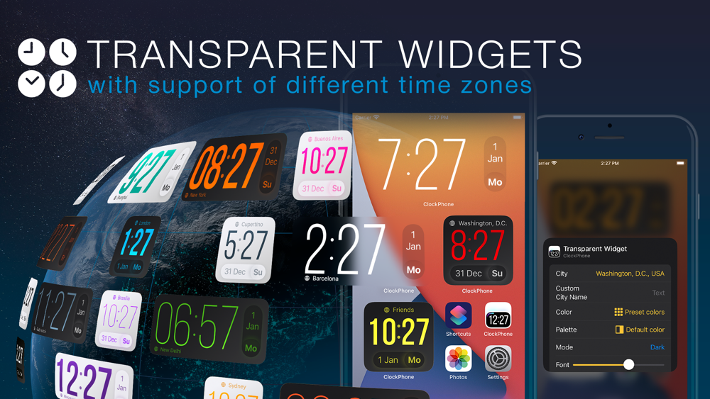 With iOS 14, you can use widgets on your Home Screen. ClockPhone Widget allows you to see time and date in large size without entering the application. Two sizes are available.