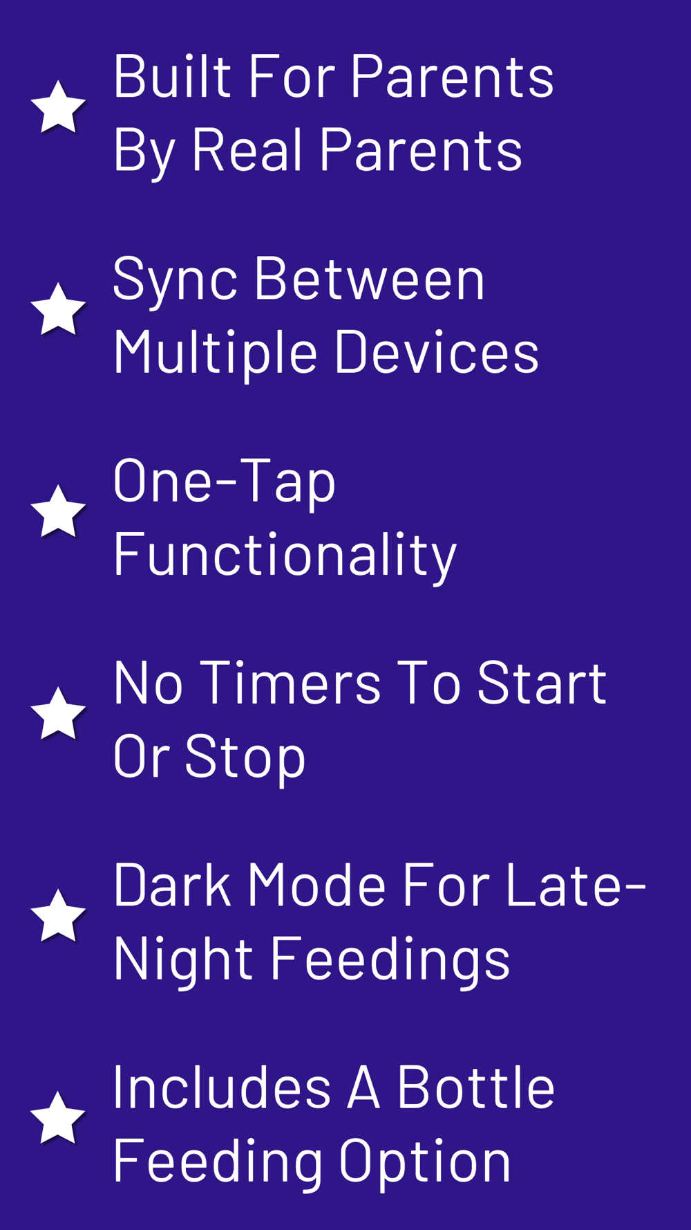 This app is designed by parents for parents. Designed to be super simple and super easy to use. This app does NOT do everything, it does just one thing and does it very well: Track when you last fed your baby, and which side the baby nursed from if breastfeeding.
