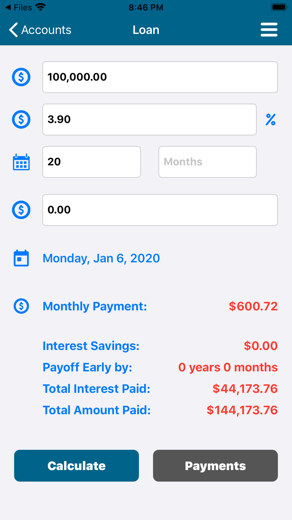 - Loan Calculator to give you an idea of how a new loan will affect your finances. Complete with a list of all monthly payments and interest for each payment. Display amortization list to show how each payment will effect principal balance and interest per payment.