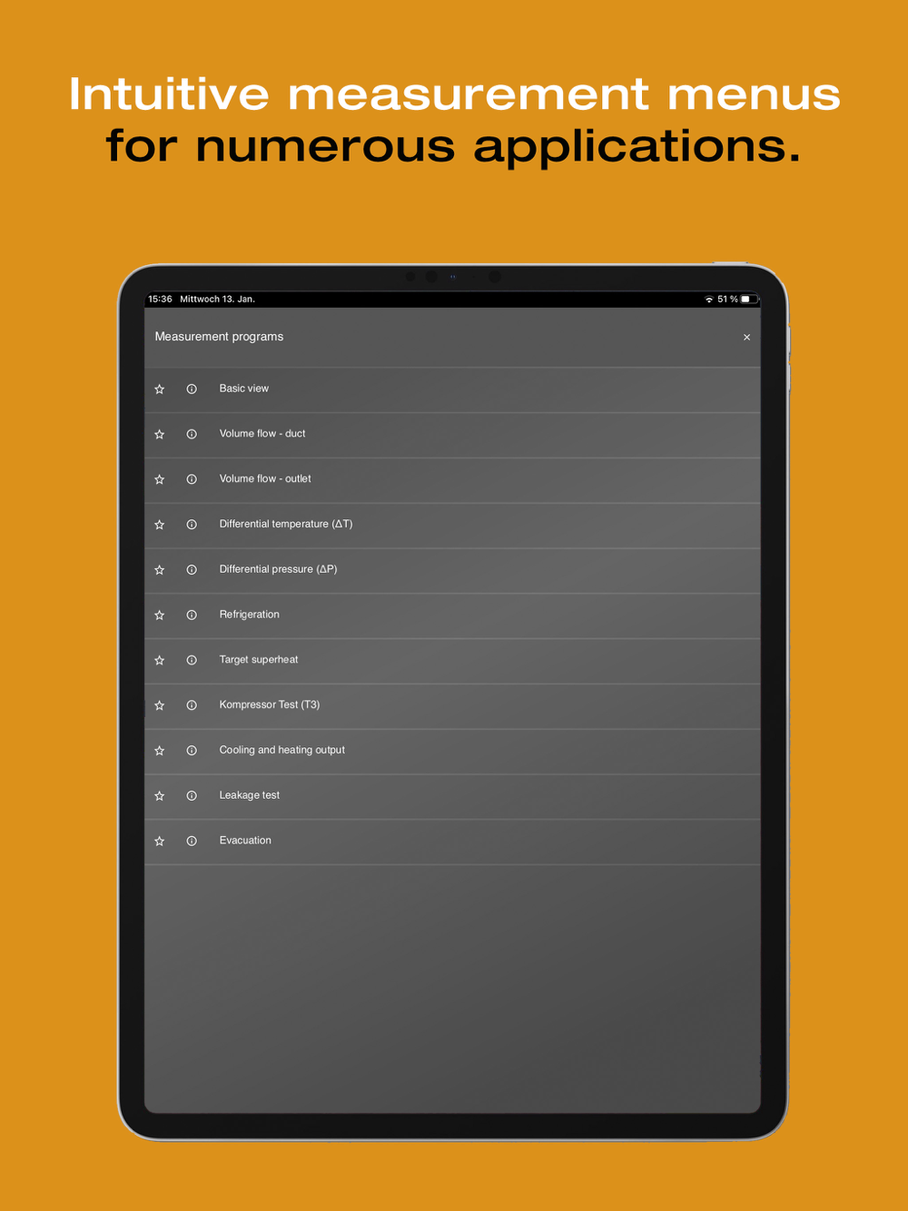 - All in one: The testo Smart App guides you easily and quickly through measurements on refrigeration, air conditioning and heating systems, air flow, and many more applications.