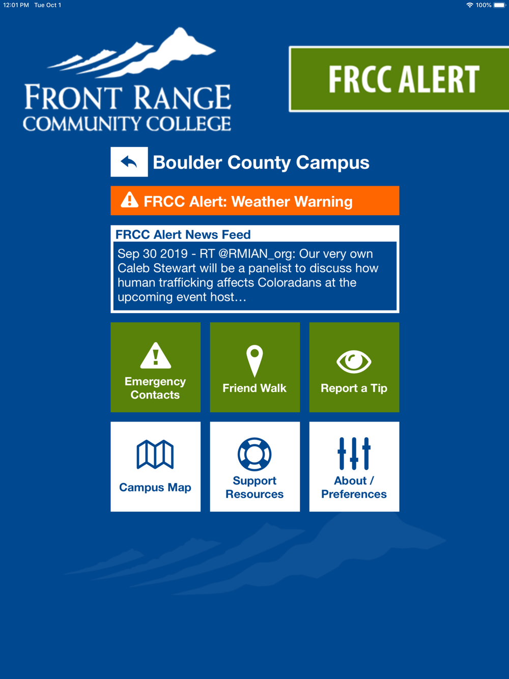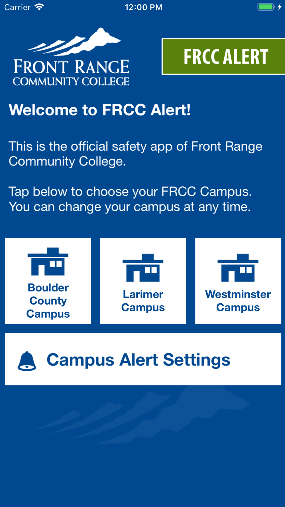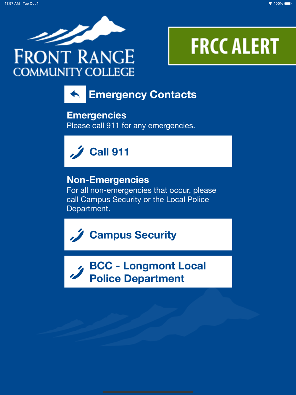 FRCC Alert is the official safety app of Front Range Community College. It is the only app that integrates with FRCC's safety and security systems. Campus Safety and Security has worked to develop a unique app that provides students, faculty and staff with added safety on the FRCC campus. The app will send you important safety alerts and provide instant access to campus safety resources.