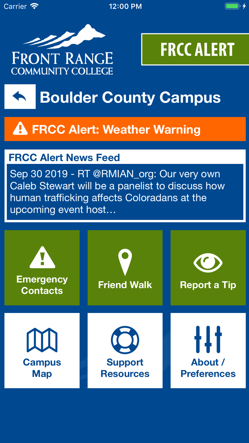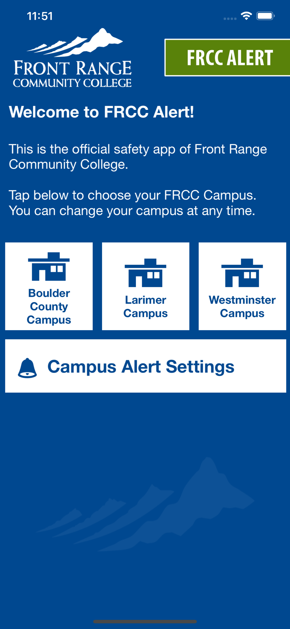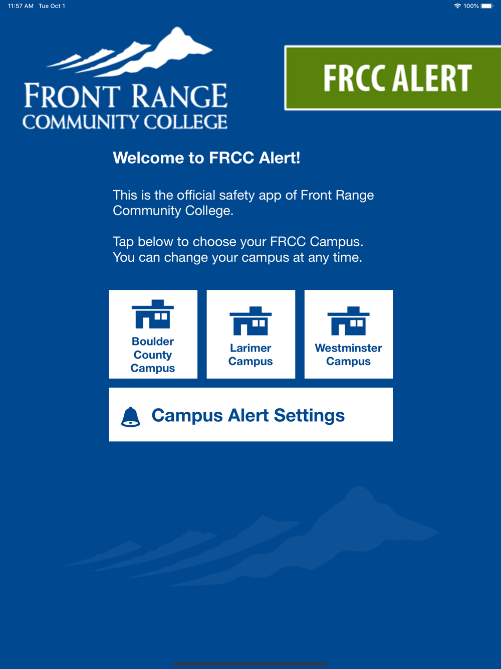 FRCC Alert is the official safety app of Front Range Community College. It is the only app that integrates with FRCC's safety and security systems. Campus Safety and Security has worked to develop a unique app that provides students, faculty and staff with added safety on the FRCC campus. The app will send you important safety alerts and provide instant access to campus safety resources.