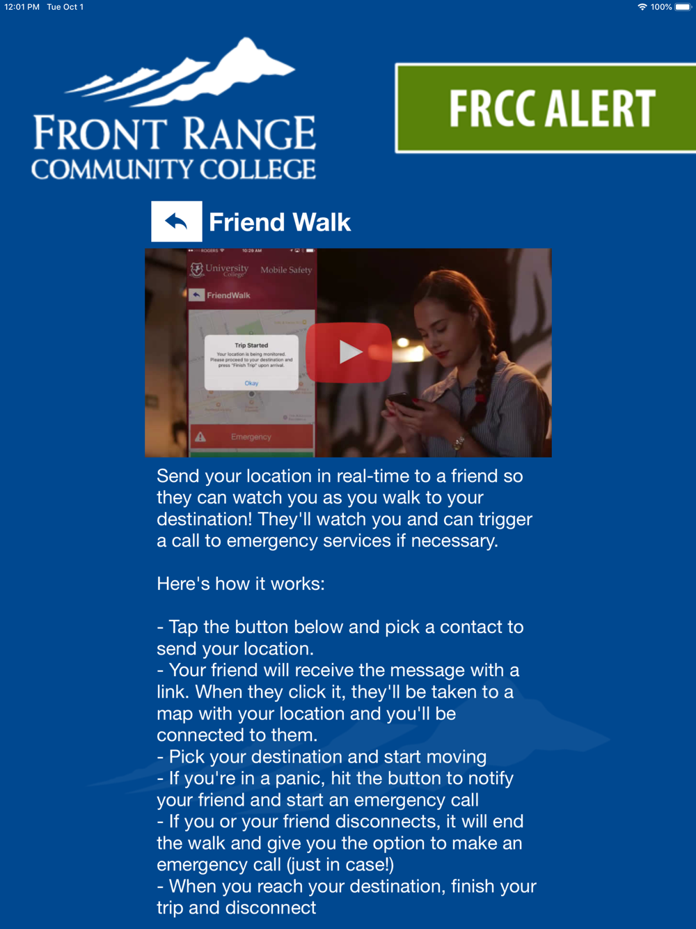 - Safety Notifications: Receive instant notifications and instructions from FRCC safety when on-campus emergencies occur.
