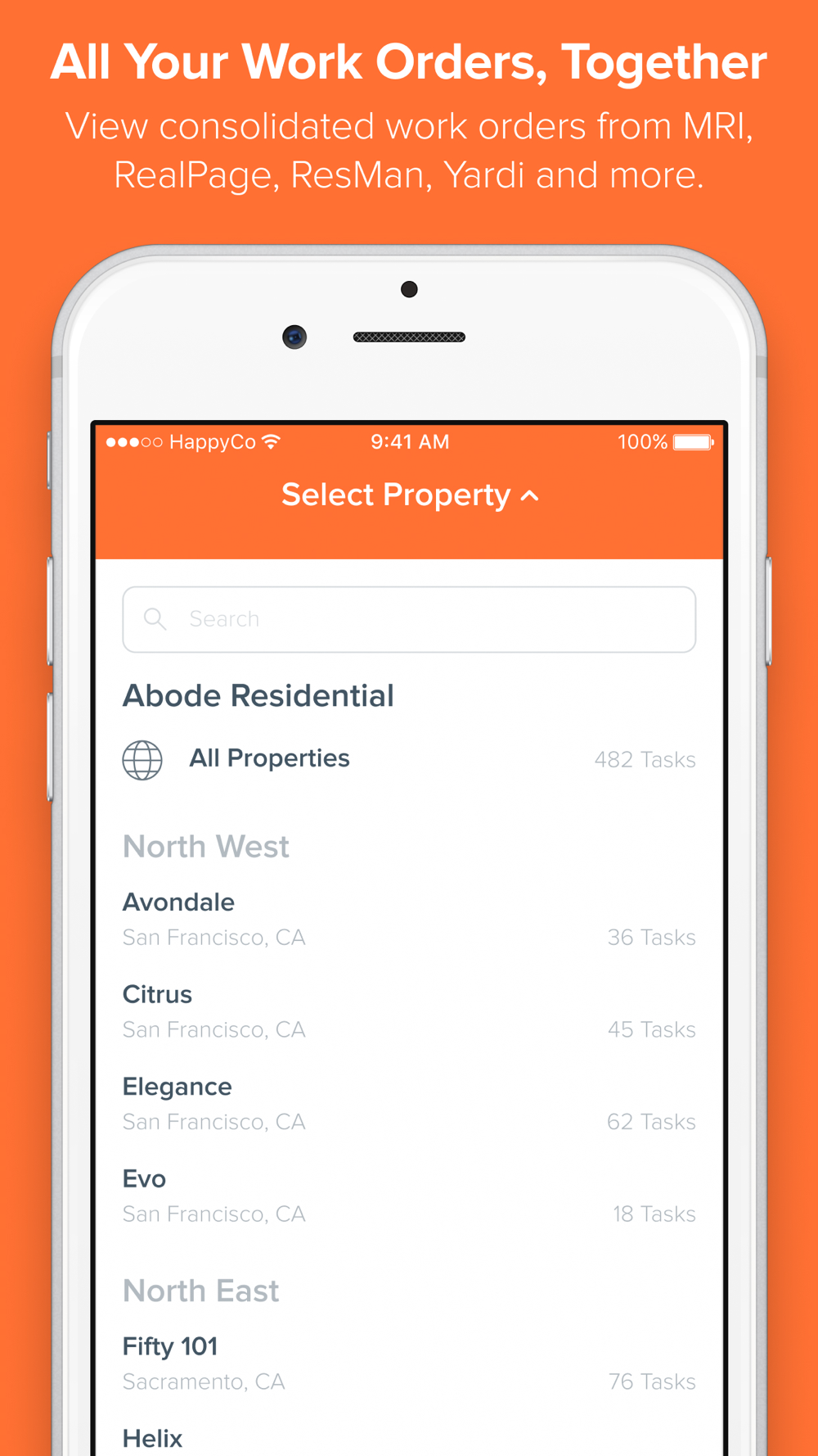 Tasks by HappyCo integrates with the key multifamily work order systems — Yardi, RealPage, MRI, ResMan, Entrata, Rent Manager, and more — letting you manage every aspect of your property's maintenance in a single place. Built exclusively for multifamily, Tasks works seamlessly with HappyCo’s Inspections and Call Complete apps, automatically generating tasks from inspection items as well as missed resident maintenance calls. From make ready to life safety, ongoing maintenance to curb appeal, Tasks helps you prioritize and manage action items for every member of your team.