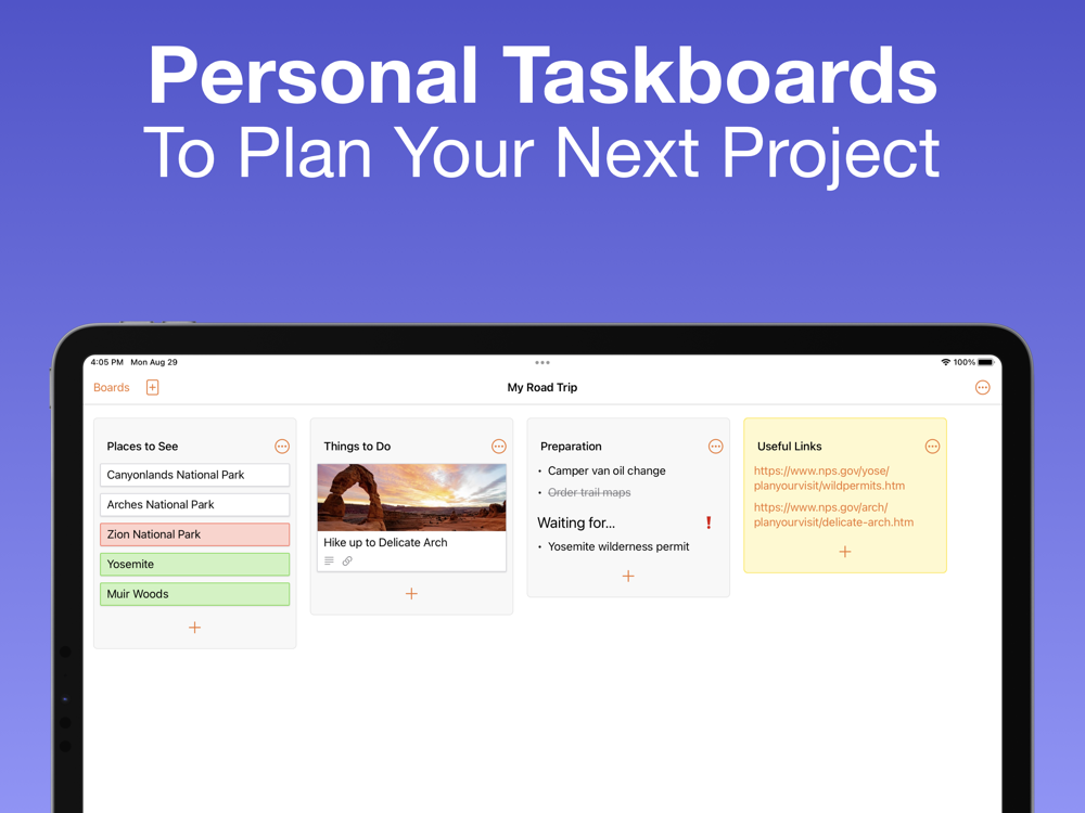 Each list can represent a step in your workflow. By dragging an item from list to list, you see how it progresses towards completion. For example, track which tasks are still in the backlog, which are in progress, blocked, and completed. Or plan a party and keep track of invitations sent and replies yet to be received.