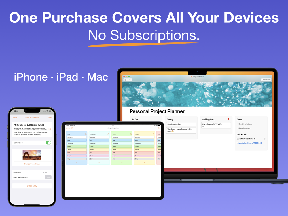 SIMPLE PRICING / NO SUBSCRIPTIONS: Boards is a single universal purchase covering all devices (iPhone, iPad, Mac). It includes new feature updates for one year and lifetime bugfix and macOS/iOS compatibility updates.